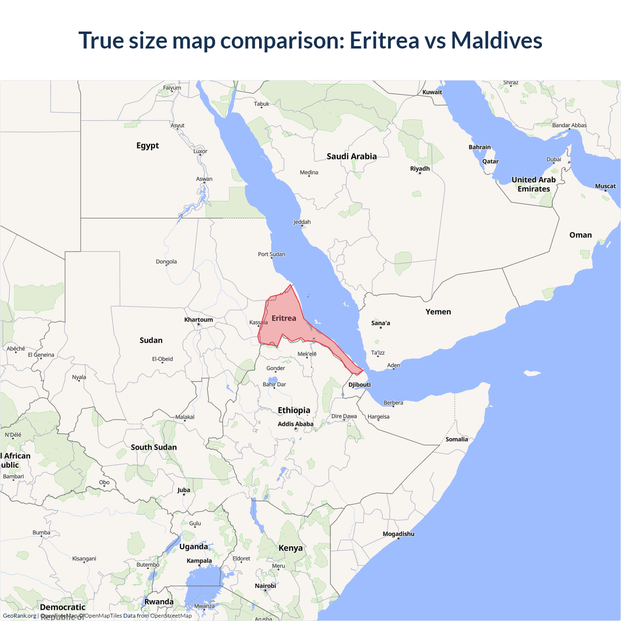 - Eritrea ranks 99/197 by total surface area vs 188/197 for Maldives.