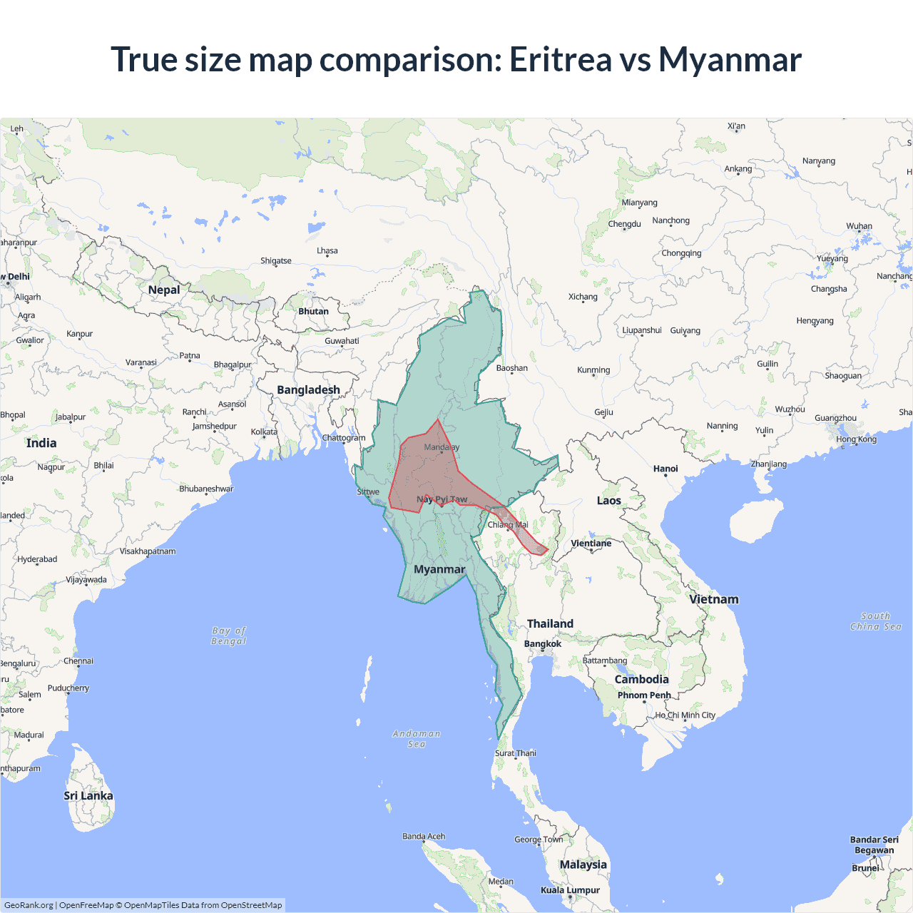 The map above outlines the borders of Eritrea and Myanmar but is not accurate for size comparison because it's a 2d map with Mercator projection that distorts territories near the poles. The farther a country is from the equator, the more magnified it appears. More about country size projections.