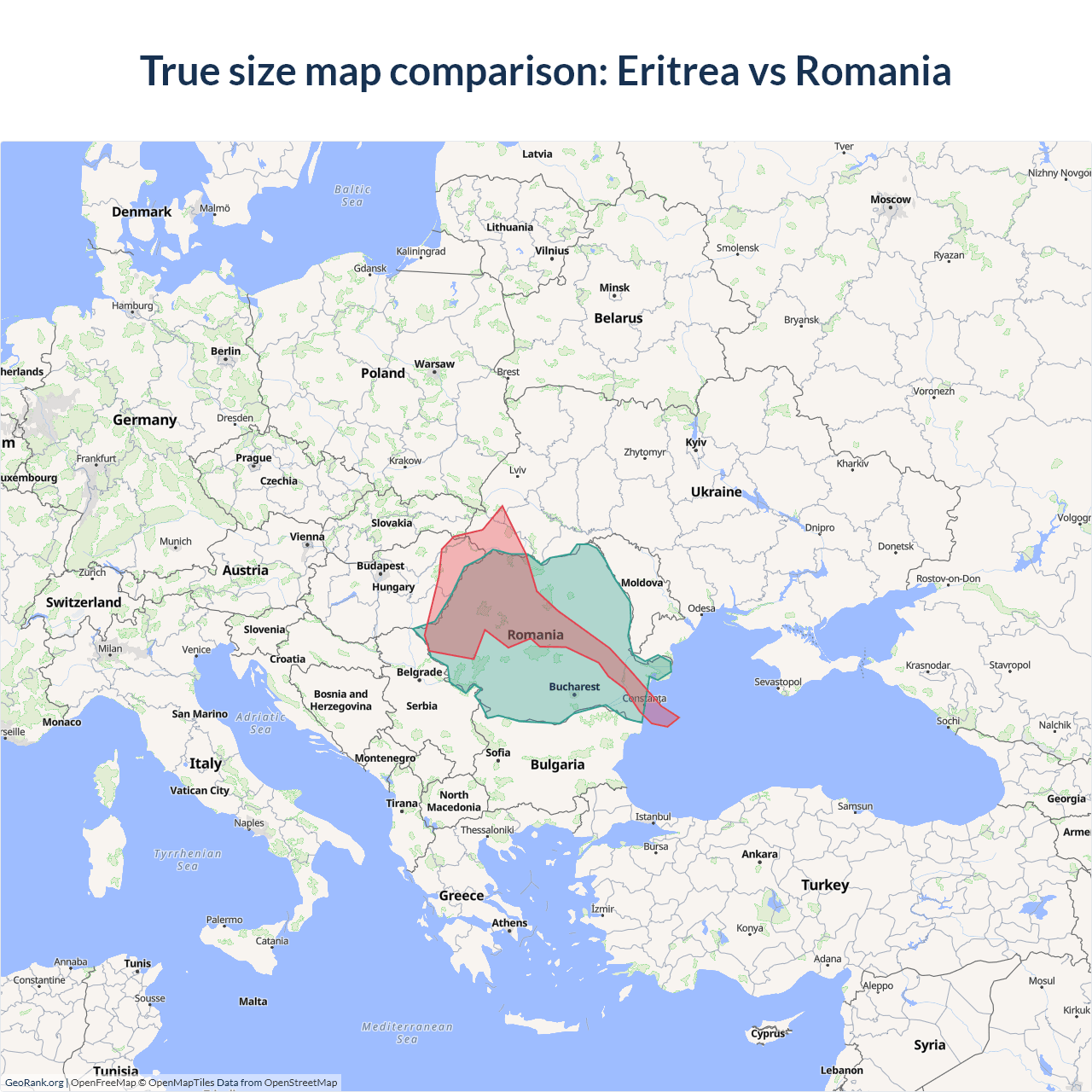 The map above outlines the borders of Eritrea and Romania but is not accurate for size comparison because it's a 2d map with Mercator projection that distorts territories near the poles. The farther a country is from the equator, the more magnified it appears. More about country size projections.