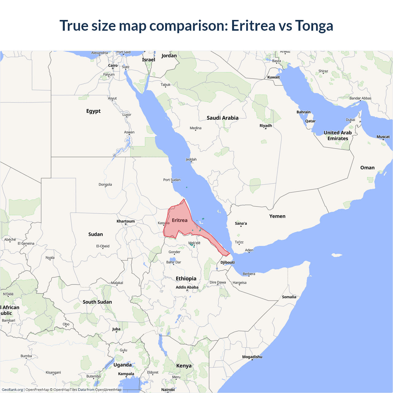 The map above outlines the borders of Eritrea and Tonga but is not accurate for size comparison because it's a 2d map with Mercator projection that distorts territories near the poles. The farther a country is from the equator, the more magnified it appears. More about country size projections.