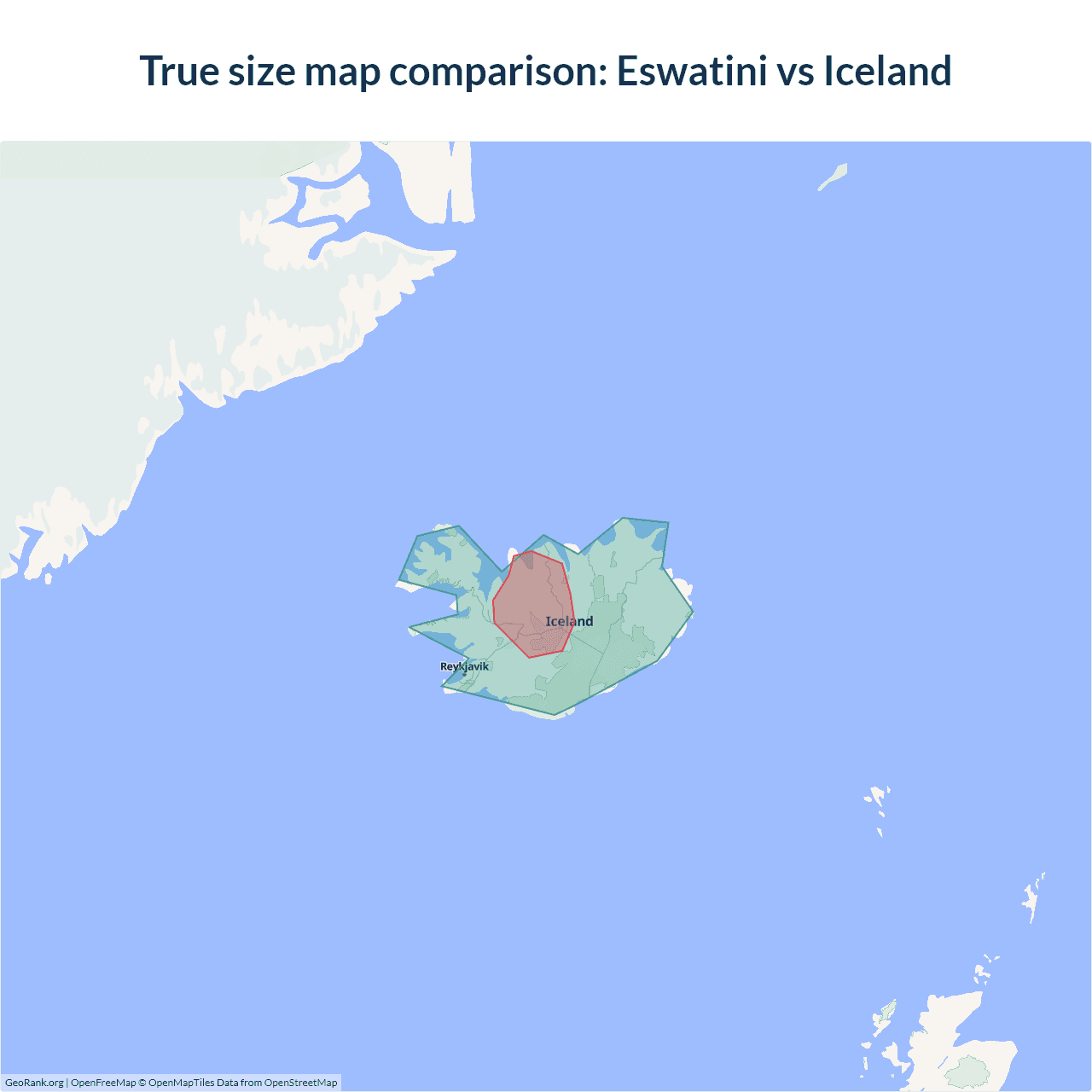 The map above outlines the borders of Eswatini and Iceland but is not accurate for size comparison because it's a 2d map with Mercator projection that distorts territories near the poles. The farther a country is from the equator, the more magnified it appears. More about country size projections.