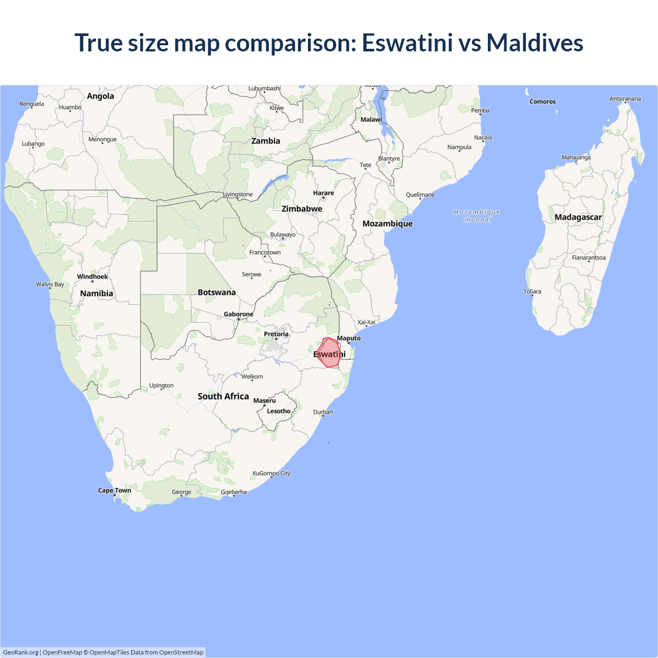 The map above outlines the borders of Eswatini and Maldives but is not accurate for size comparison because it's a 2d map with Mercator projection that distorts territories near the poles. The farther a country is from the equator, the more magnified it appears. More about country size projections.