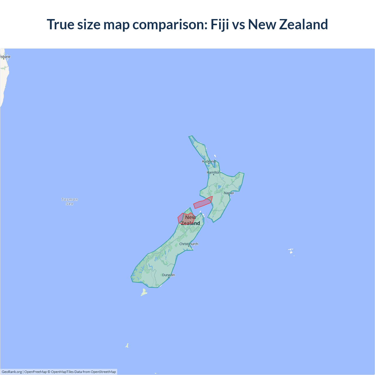 The map above outlines the borders of Fiji and New Zealand but is not accurate for size comparison because it's a 2d map with Mercator projection that distorts territories near the poles. The farther a country is from the equator, the more magnified it appears. More about country size projections.