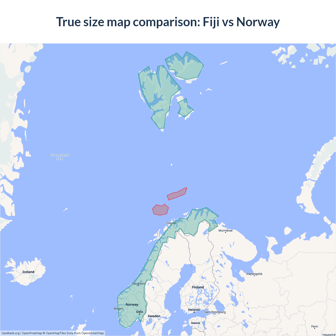 The map above outlines the borders of Fiji and Norway but is not accurate for size comparison because it's a 2d map with Mercator projection that distorts territories near the poles. The farther a country is from the equator, the more magnified it appears. More about country size projections.