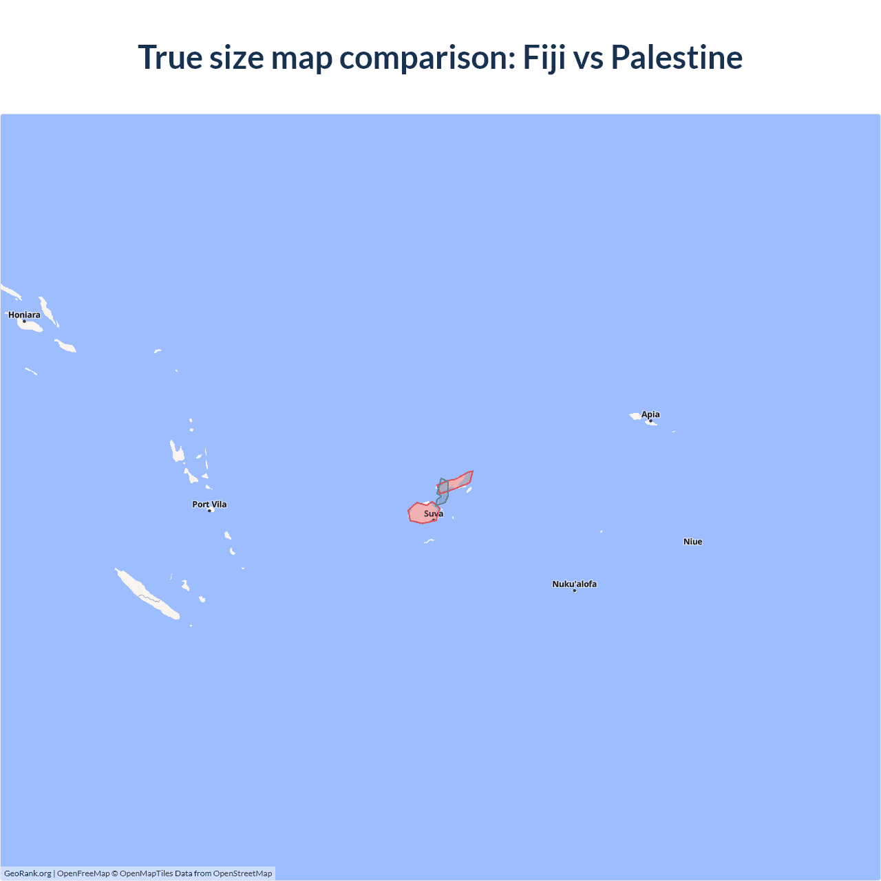 The map above outlines the borders of Fiji and Palestine but is not accurate for size comparison because it's a 2d map with Mercator projection that distorts territories near the poles. The farther a country is from the equator, the more magnified it appears. More about country size projections.