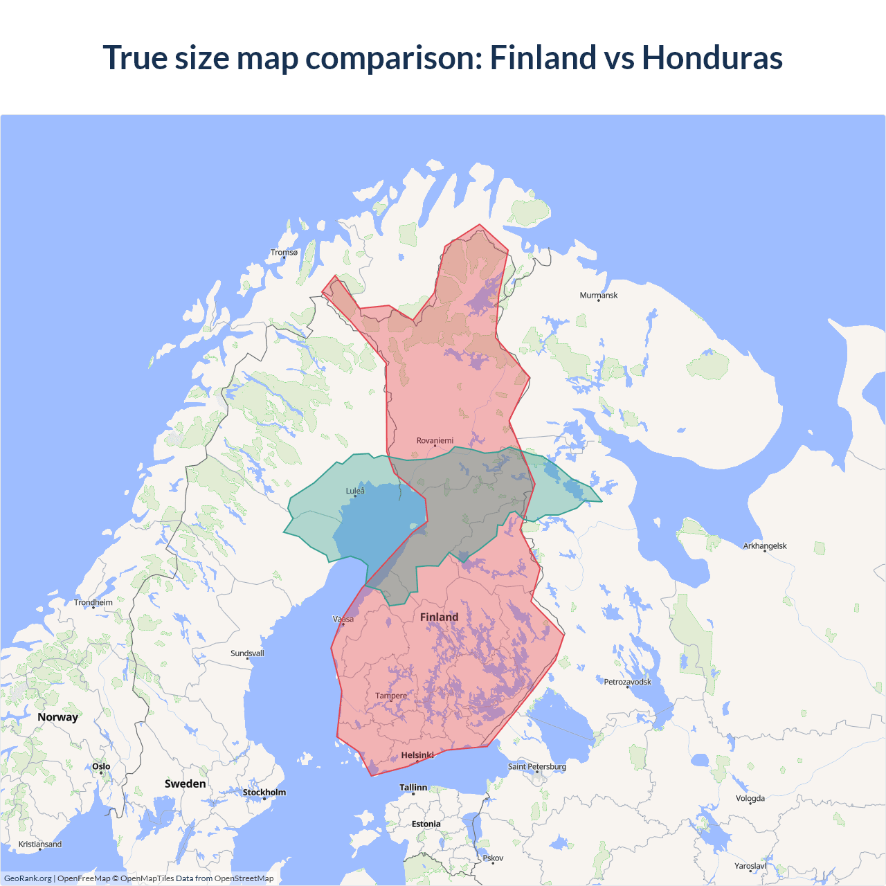 The map above outlines the borders of Finland and Honduras but is not accurate for size comparison because it's a 2d map with Mercator projection that distorts territories near the poles. The farther a country is from the equator, the more magnified it appears. More about country size projections.