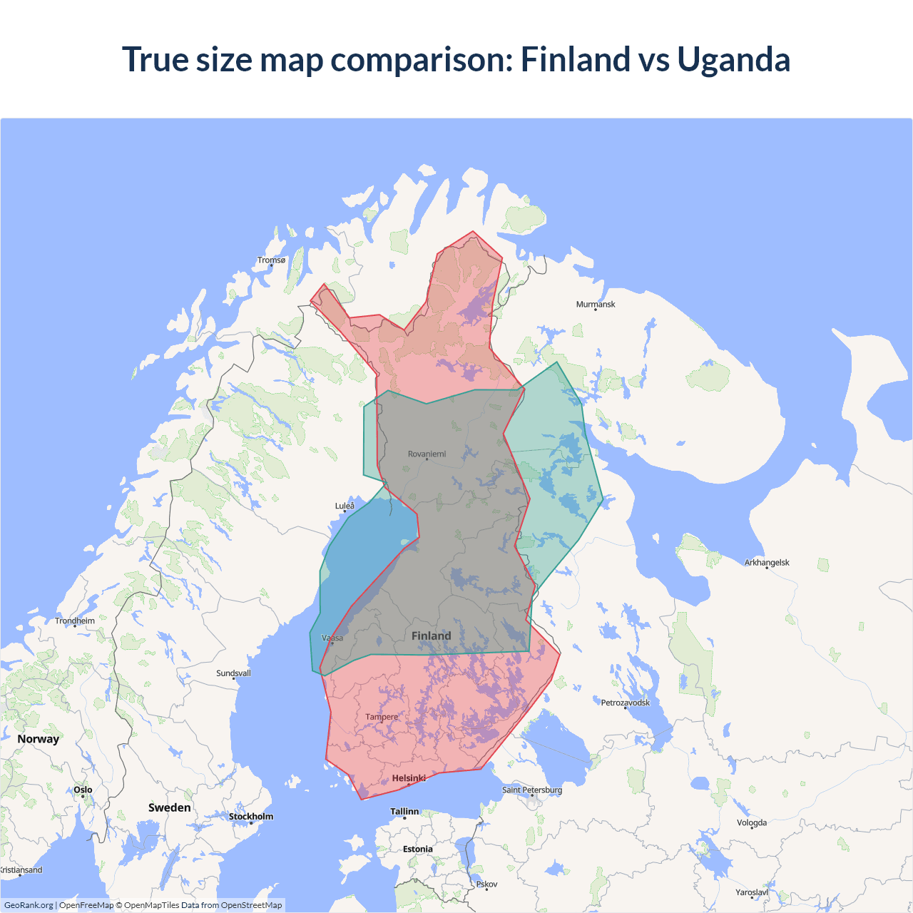 The map above outlines the borders of Finland and Uganda but is not accurate for size comparison because it's a 2d map with Mercator projection that distorts territories near the poles. The farther a country is from the equator, the more magnified it appears. More about country size projections.