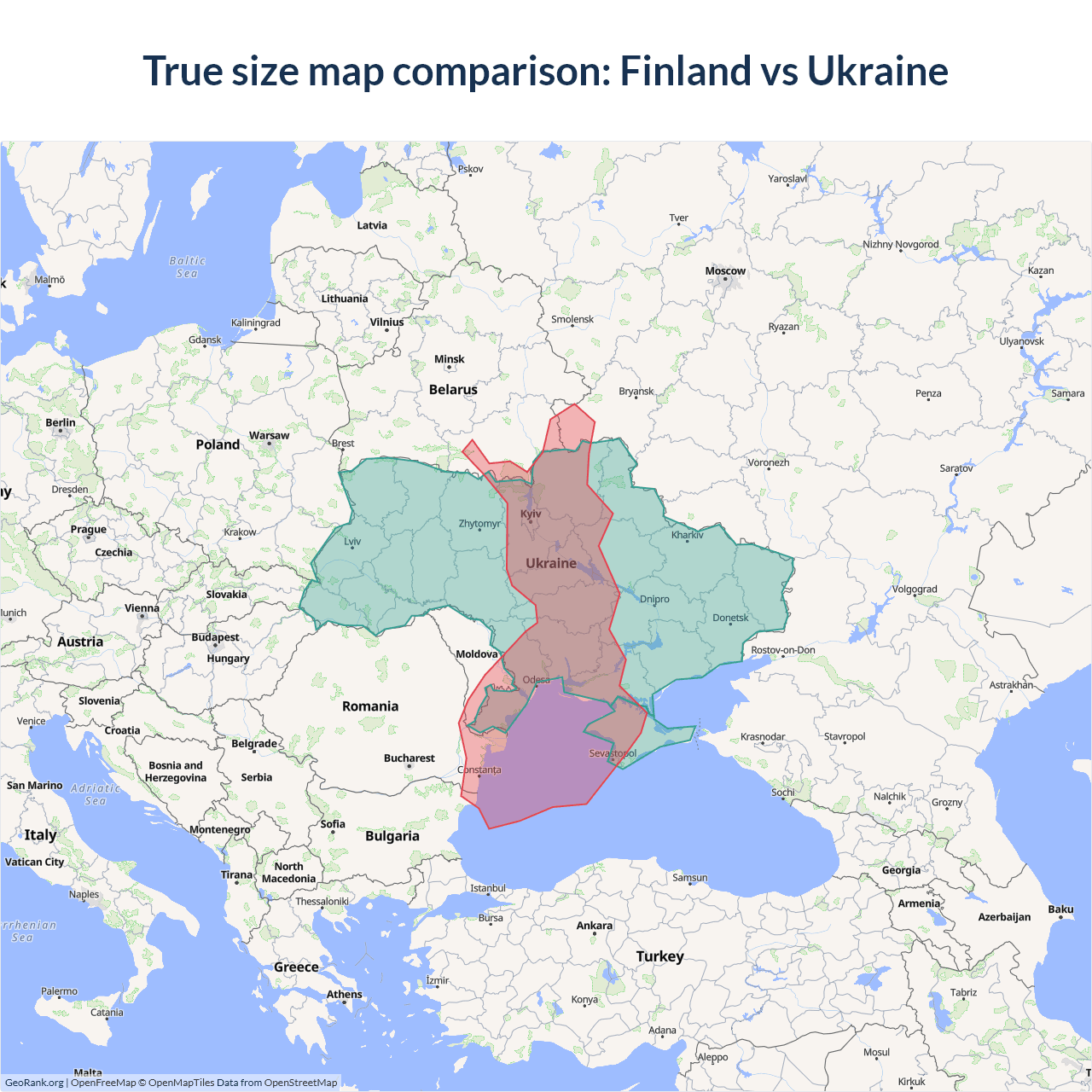 The map above outlines the borders of Finland and Ukraine but is not accurate for size comparison because it's a 2d map with Mercator projection that distorts territories near the poles. The farther a country is from the equator, the more magnified it appears. More about country size projections.