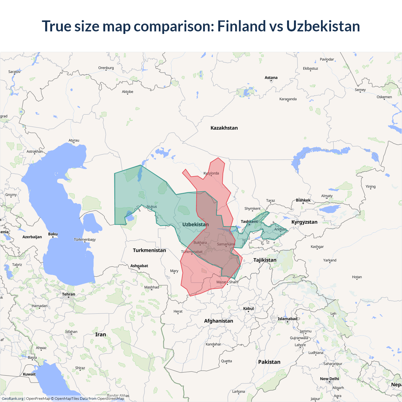 The map above outlines the borders of Finland and Uzbekistan but is not accurate for size comparison because it's a 2d map with Mercator projection that distorts territories near the poles. The farther a country is from the equator, the more magnified it appears. More about country size projections.