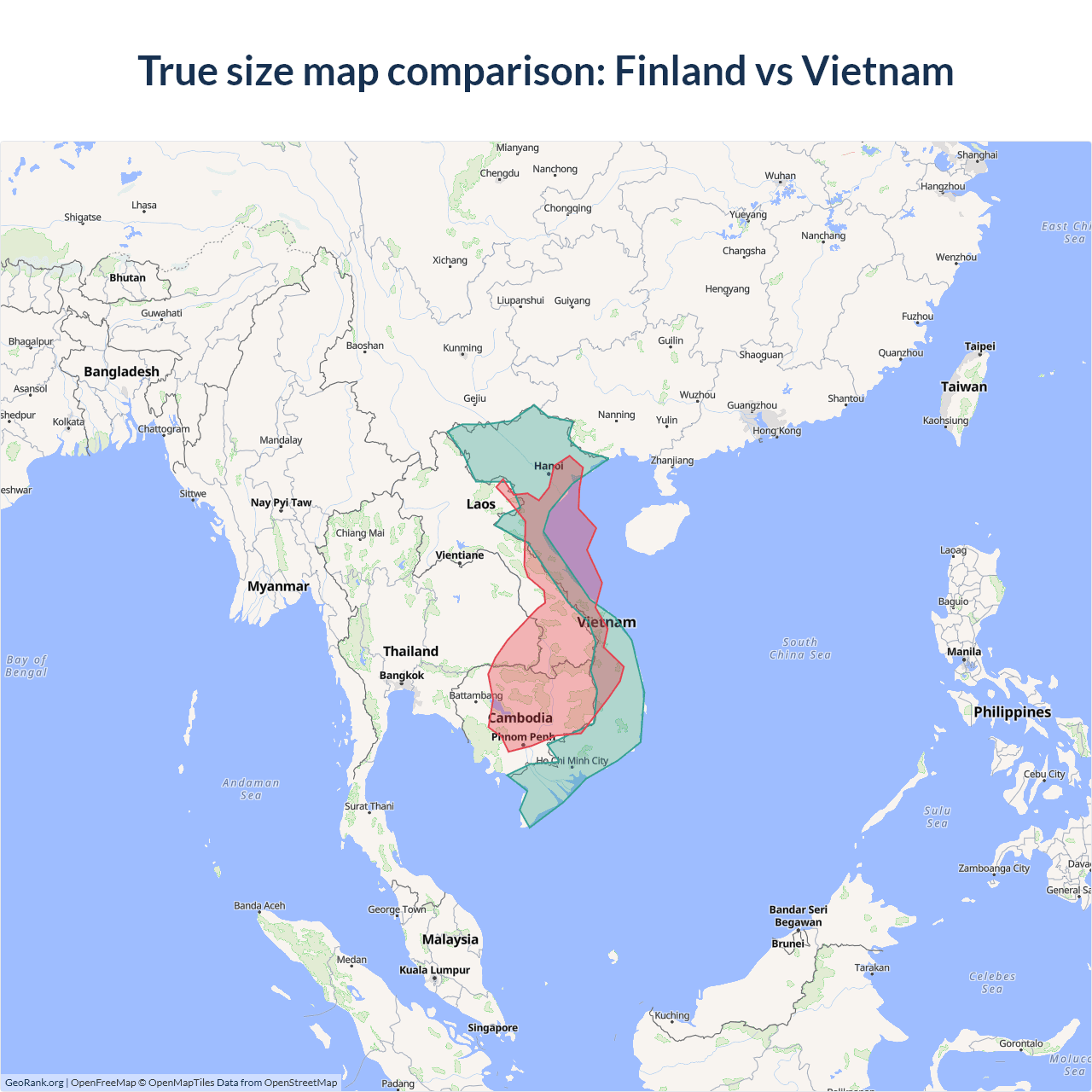 The map above outlines the borders of Finland and Vietnam but is not accurate for size comparison because it's a 2d map with Mercator projection that distorts territories near the poles. The farther a country is from the equator, the more magnified it appears. More about country size projections.