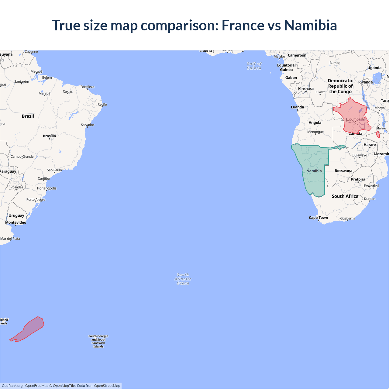 The map above outlines the borders of France and Namibia but is not accurate for size comparison because it's a 2d map with Mercator projection that distorts territories near the poles. The farther a country is from the equator, the more magnified it appears. More about country size projections.