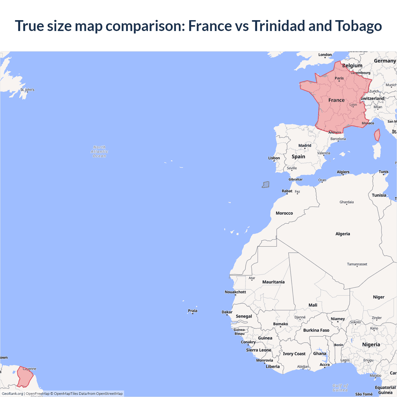 The map above outlines the borders of France and Trinidad and Tobago but is not accurate for size comparison because it's a 2d map with Mercator projection that distorts territories near the poles. The farther a country is from the equator, the more magnified it appears. More about country size projections.