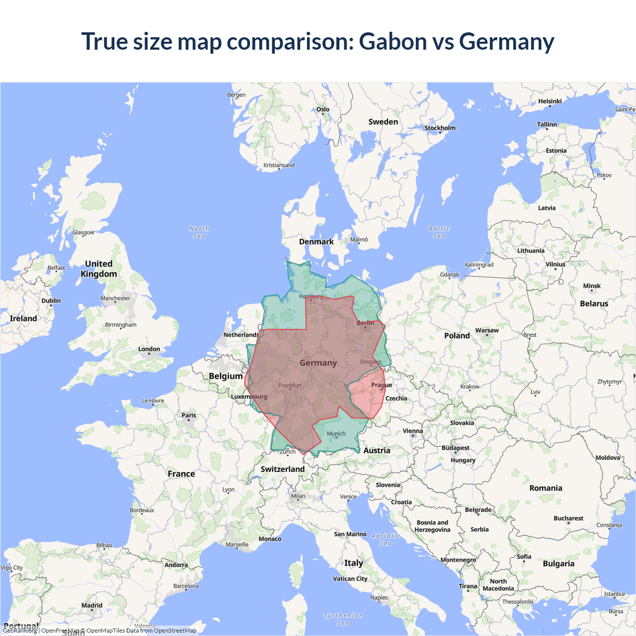 The map above outlines the borders of Gabon and Germany but is not accurate for size comparison because it's a 2d map with Mercator projection that distorts territories near the poles. The farther a country is from the equator, the more magnified it appears. More about country size projections.