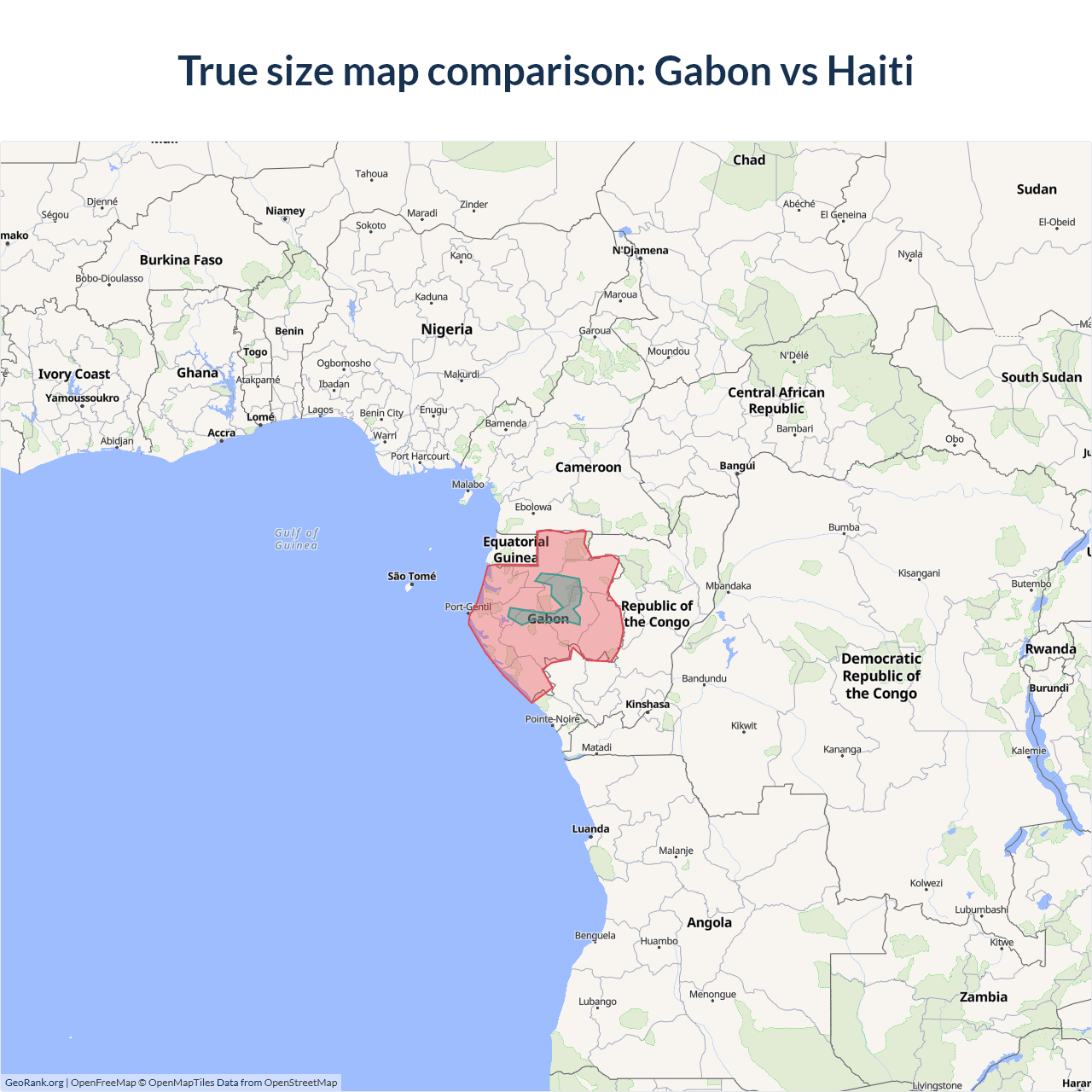 The map above outlines the borders of Gabon and Haiti but is not accurate for size comparison because it's a 2d map with Mercator projection that distorts territories near the poles. The farther a country is from the equator, the more magnified it appears. More about country size projections.
