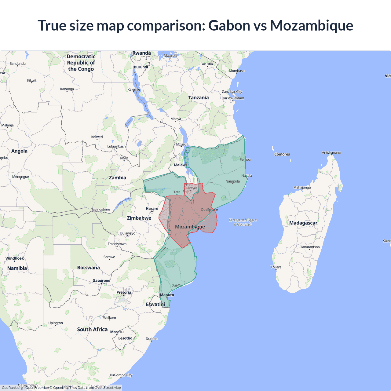 The map above outlines the borders of Gabon and Mozambique but is not accurate for size comparison because it's a 2d map with Mercator projection that distorts territories near the poles. The farther a country is from the equator, the more magnified it appears. More about country size projections.