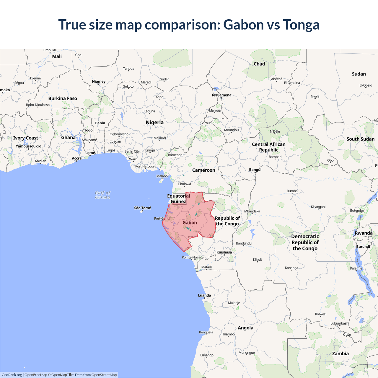 The map above outlines the borders of Gabon and Tonga but is not accurate for size comparison because it's a 2d map with Mercator projection that distorts territories near the poles. The farther a country is from the equator, the more magnified it appears. More about country size projections.