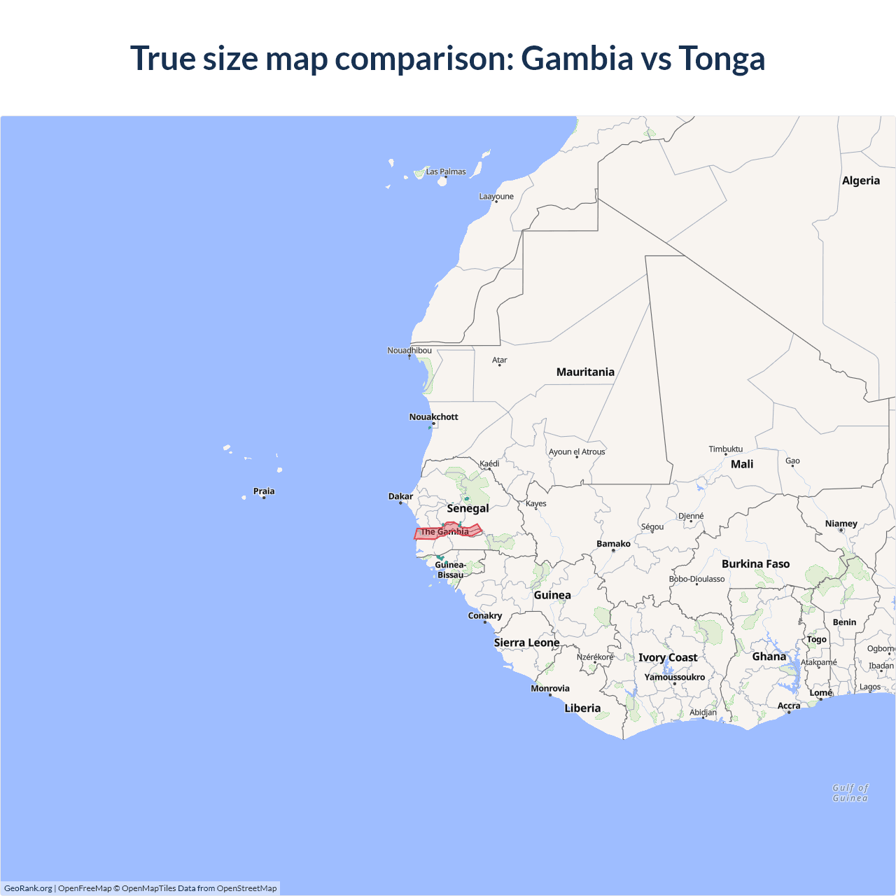 The map above outlines the borders of the Gambia and Tonga but is not accurate for size comparison because it's a 2d map with Mercator projection that distorts territories near the poles. The farther a country is from the equator, the more magnified it appears. More about country size projections.