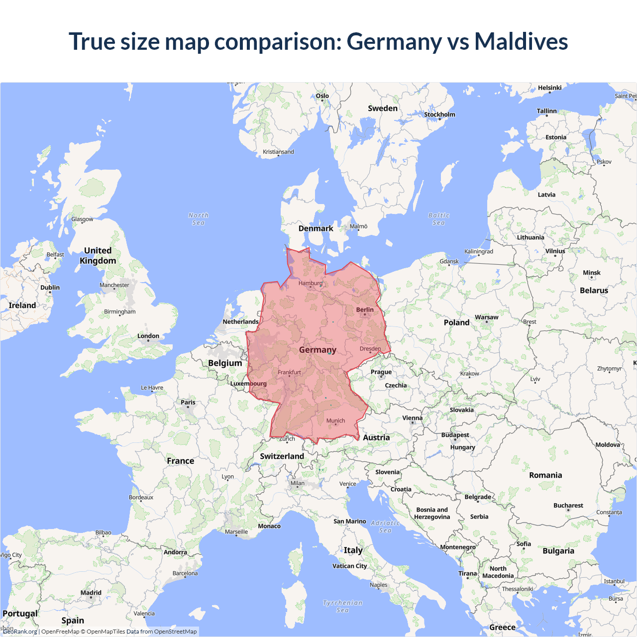 The map above outlines the borders of Germany and Maldives but is not accurate for size comparison because it's a 2d map with Mercator projection that distorts territories near the poles. The farther a country is from the equator, the more magnified it appears. More about country size projections.