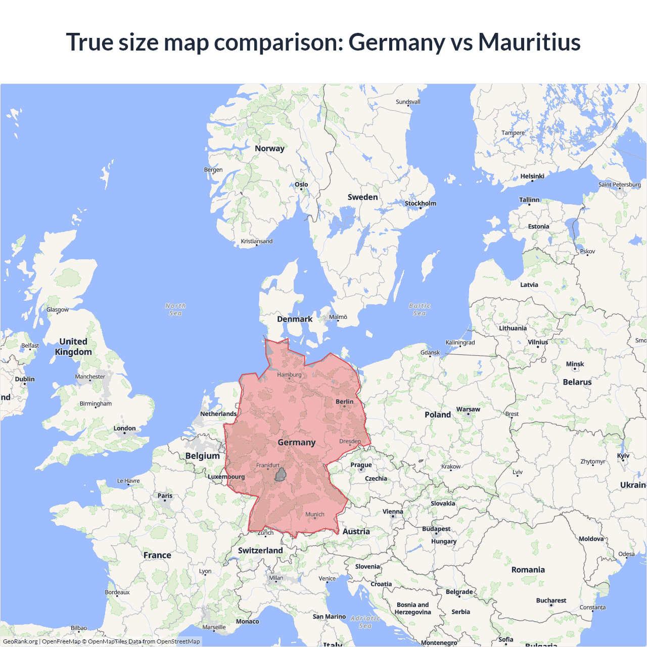 The map above outlines the borders of Germany and Mauritius but is not accurate for size comparison because it's a 2d map with Mercator projection that distorts territories near the poles. The farther a country is from the equator, the more magnified it appears. More about country size projections.