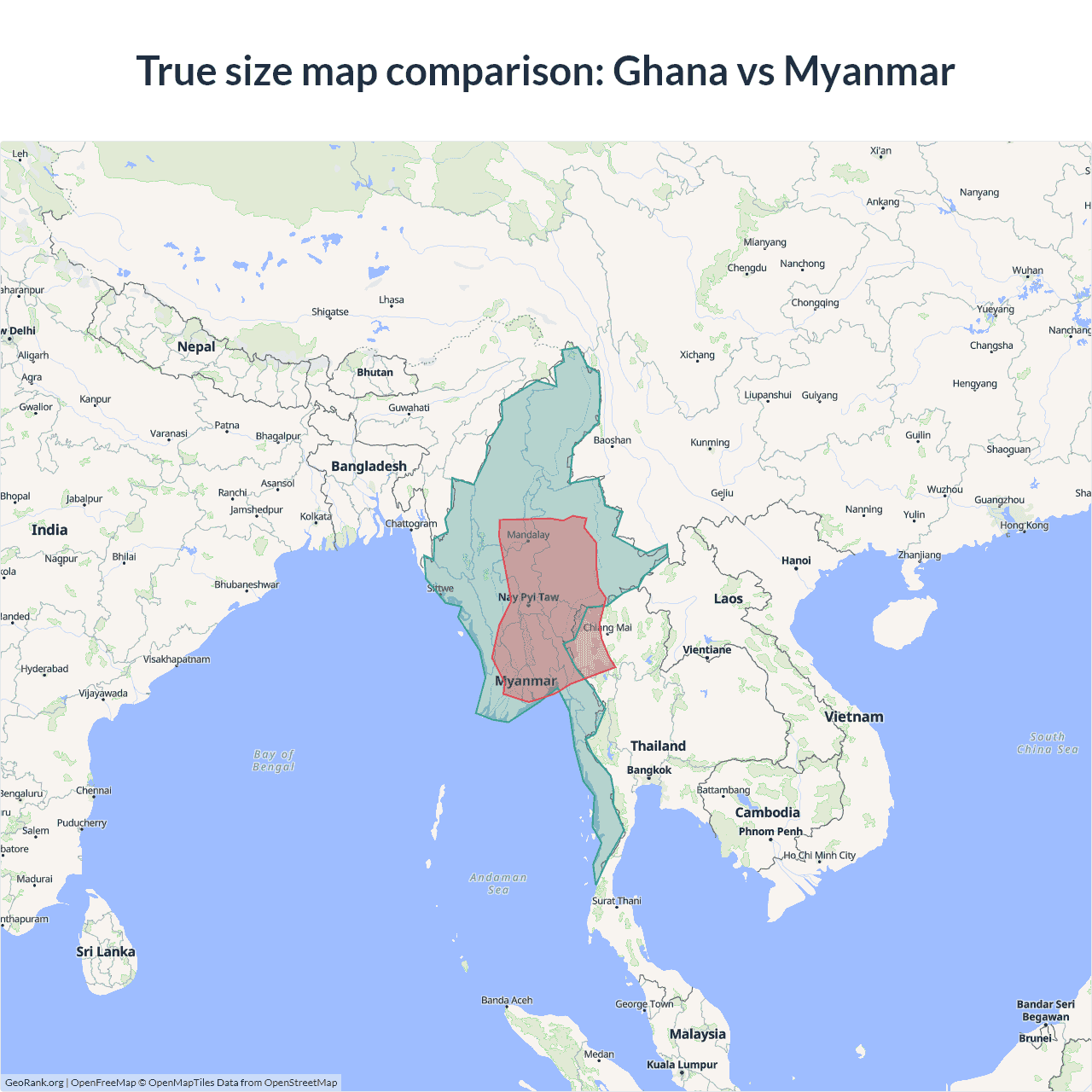 The map above outlines the borders of Ghana and Myanmar but is not accurate for size comparison because it's a 2d map with Mercator projection that distorts territories near the poles. The farther a country is from the equator, the more magnified it appears. More about country size projections.