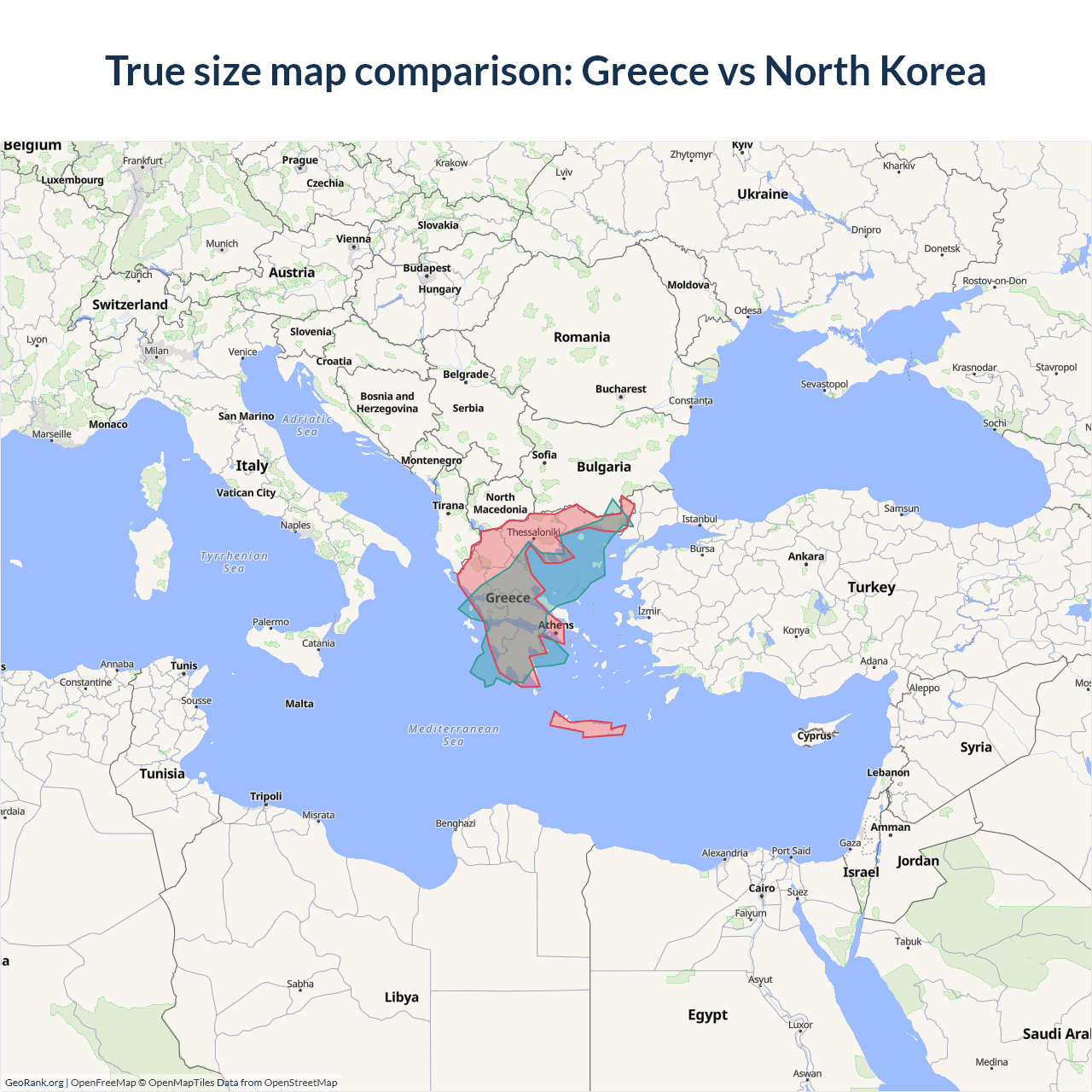 The map above outlines the borders of Greece and North Korea but is not accurate for size comparison because it's a 2d map with Mercator projection that distorts territories near the poles. The farther a country is from the equator, the more magnified it appears. More about country size projections.