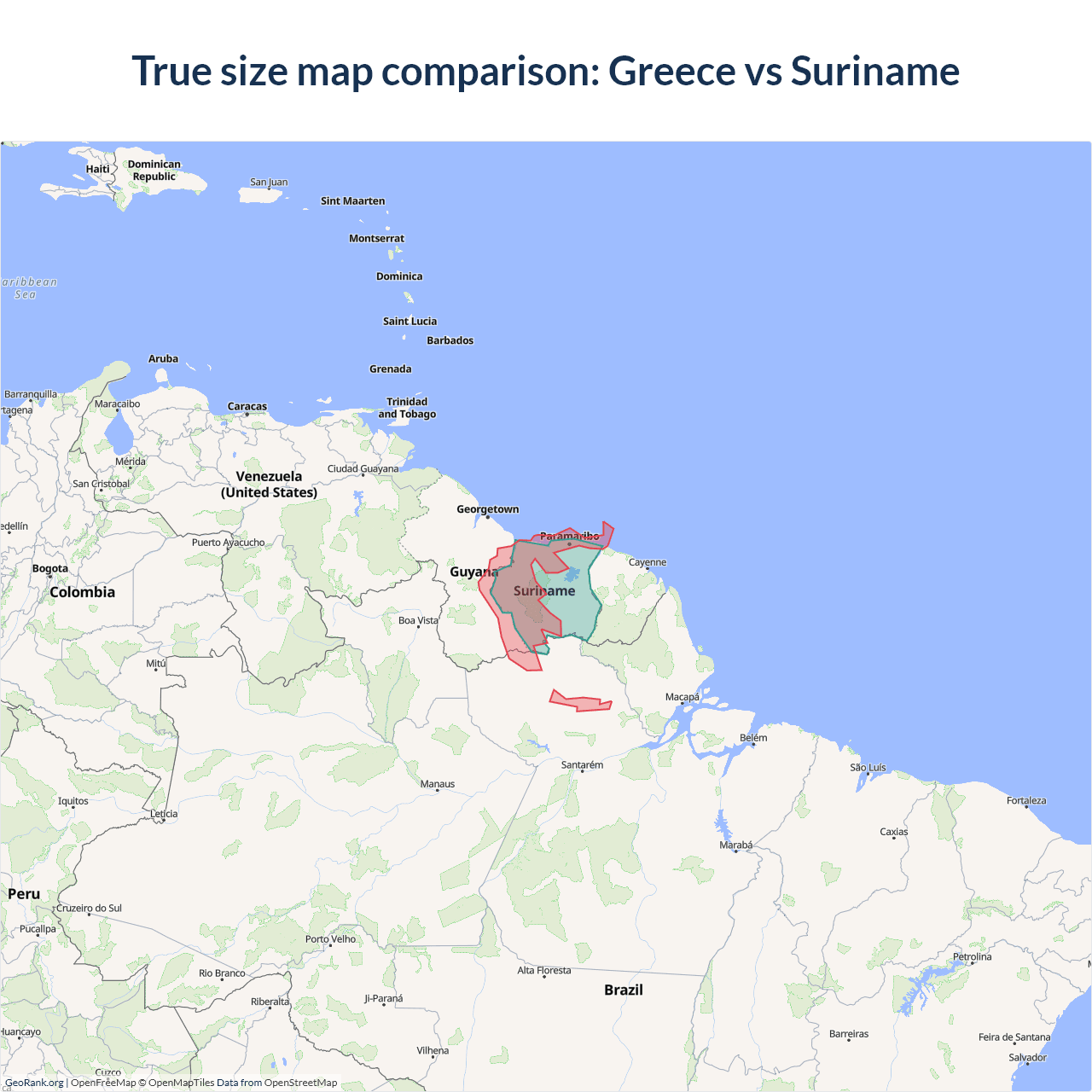 The map above outlines the borders of Greece and Suriname but is not accurate for size comparison because it's a 2d map with Mercator projection that distorts territories near the poles. The farther a country is from the equator, the more magnified it appears. More about country size projections.