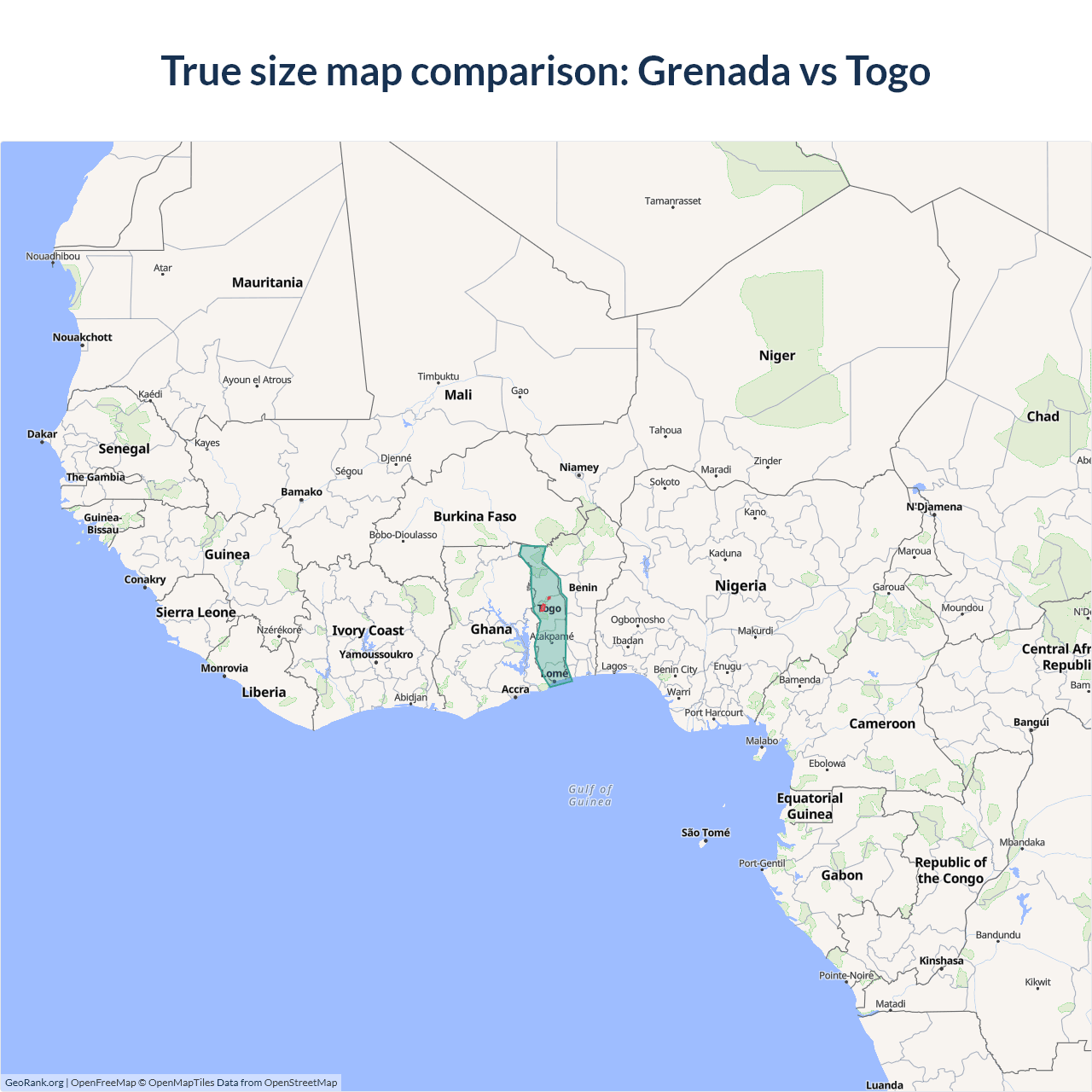The map above outlines the borders of Grenada and Togo but is not accurate for size comparison because it's a 2d map with Mercator projection that distorts territories near the poles. The farther a country is from the equator, the more magnified it appears. More about country size projections.
