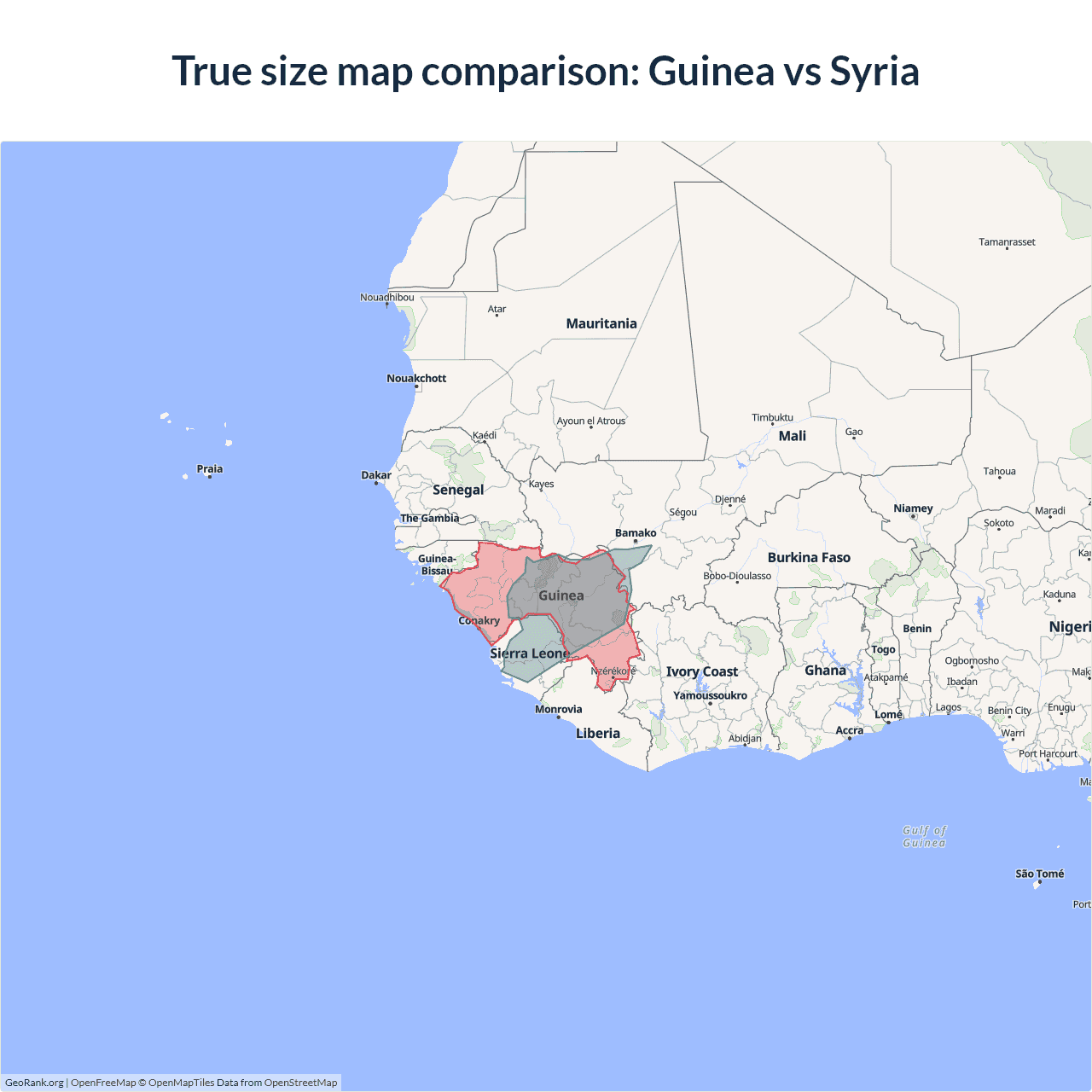 The map above outlines the borders of Guinea and Syria but is not accurate for size comparison because it's a 2d map with Mercator projection that distorts territories near the poles. The farther a country is from the equator, the more magnified it appears. More about country size projections.