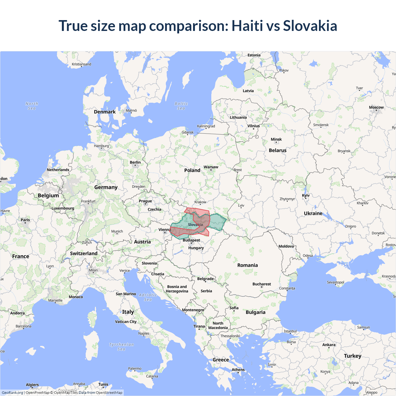 The map above outlines the borders of Haiti and Slovakia but is not accurate for size comparison because it's a 2d map with Mercator projection that distorts territories near the poles. The farther a country is from the equator, the more magnified it appears. More about country size projections.