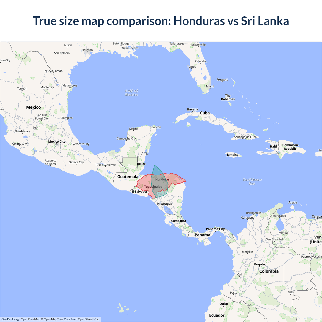 The map above outlines the borders of Honduras and Sri Lanka but is not accurate for size comparison because it's a 2d map with Mercator projection that distorts territories near the poles. The farther a country is from the equator, the more magnified it appears. More about country size projections.
