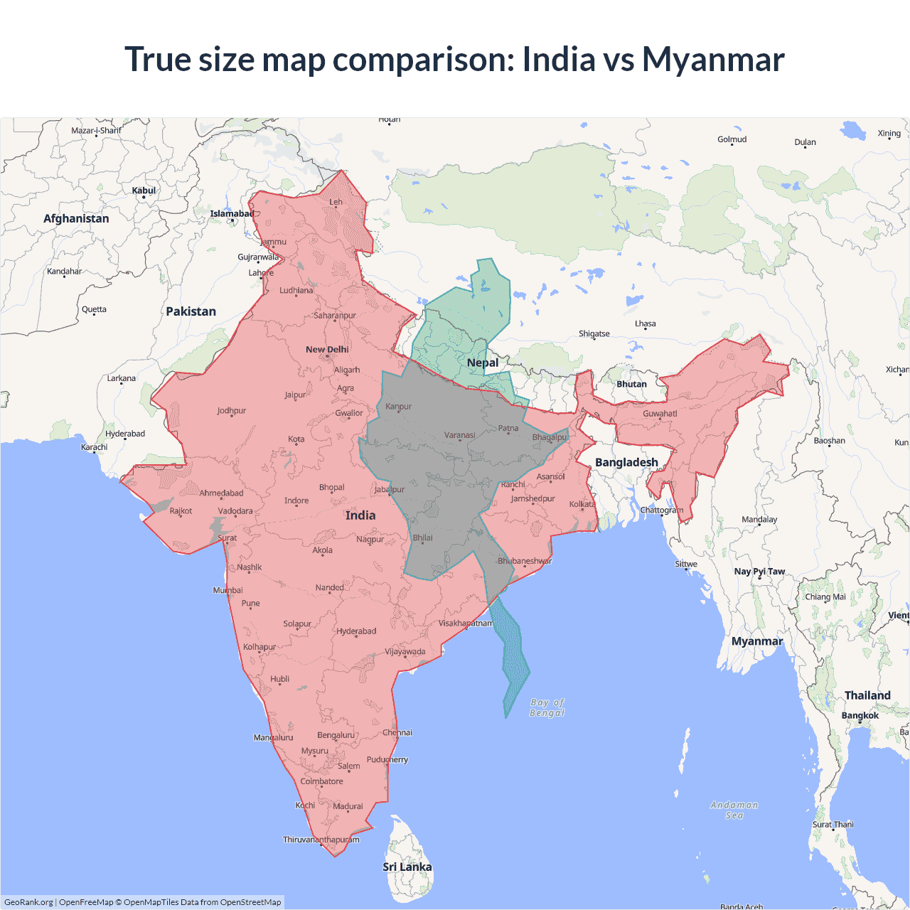 The map above outlines the borders of India and Myanmar but is not accurate for size comparison because it's a 2d map with Mercator projection that distorts territories near the poles. The farther a country is from the equator, the more magnified it appears. More about country size projections.