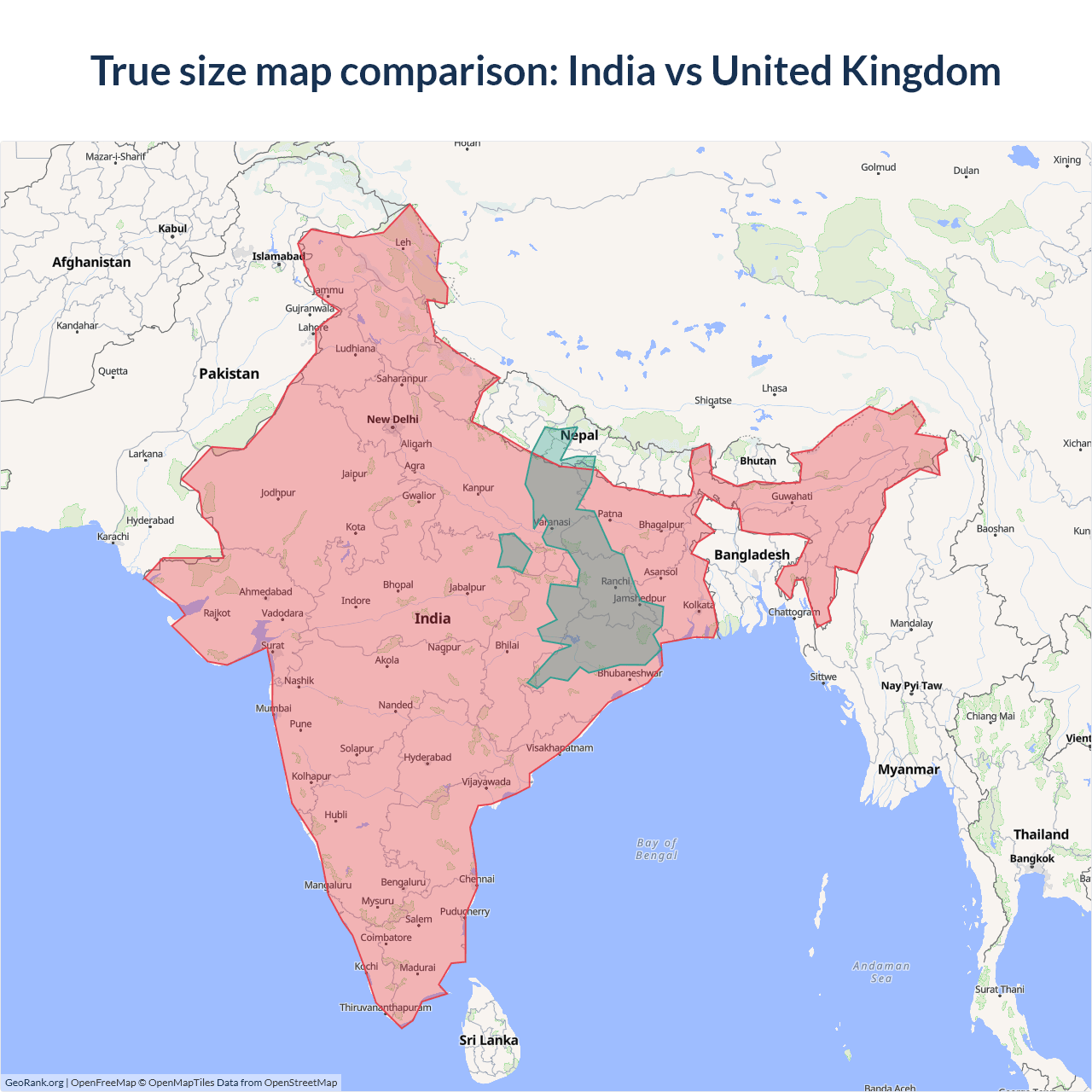 The map above outlines the borders of India and the United Kingdom but is not accurate for size comparison because it's a 2d map with Mercator projection that distorts territories near the poles. The farther a country is from the equator, the more magnified it appears. More about country size projections.