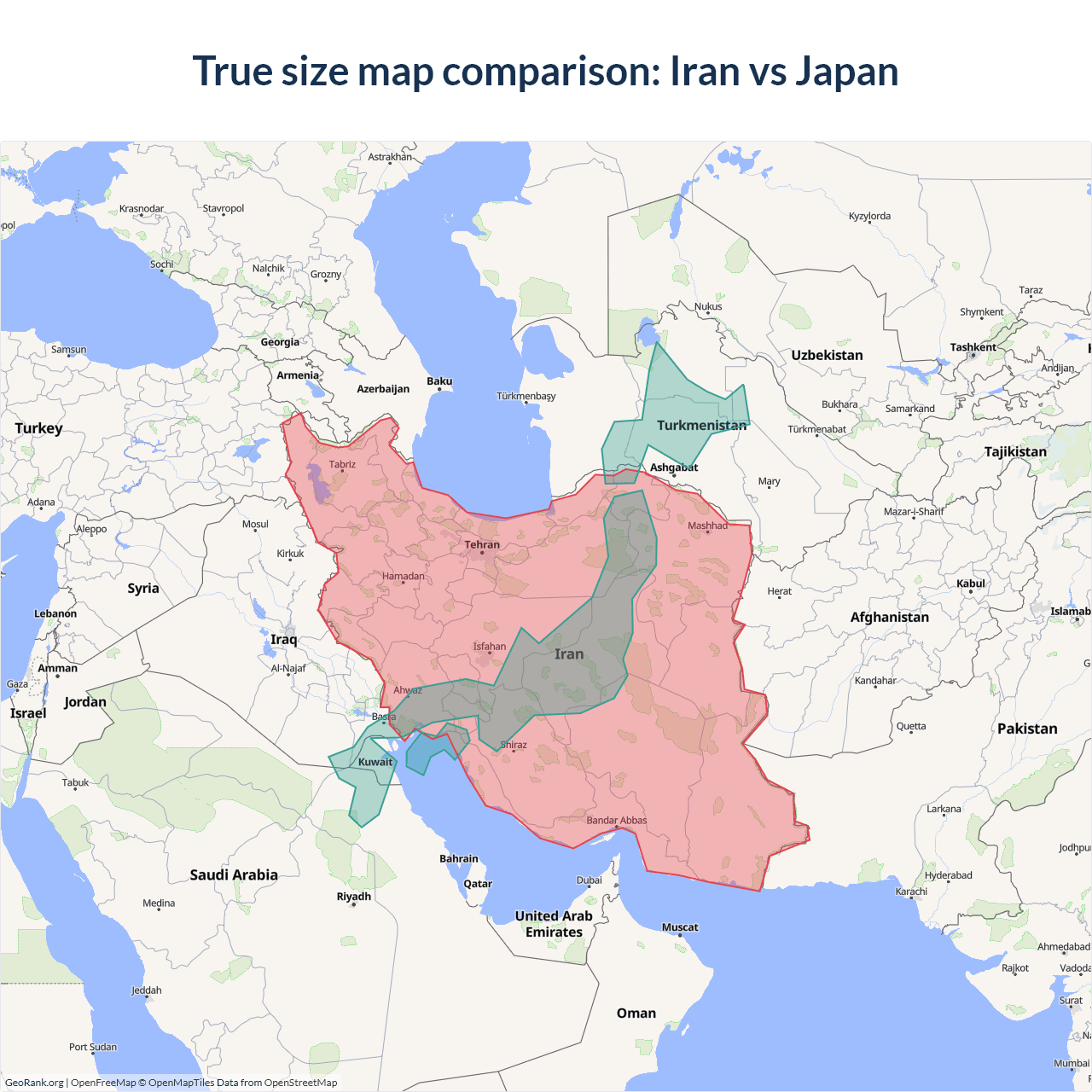 Iran vs Japan size on the map