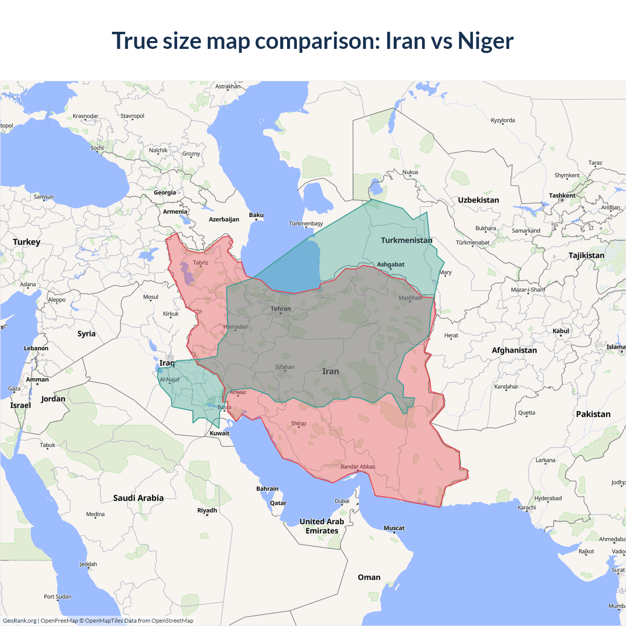 The map above outlines the borders of Iran and Niger but is not accurate for size comparison because it's a 2d map with Mercator projection that distorts territories near the poles. The farther a country is from the equator, the more magnified it appears. More about country size projections.
