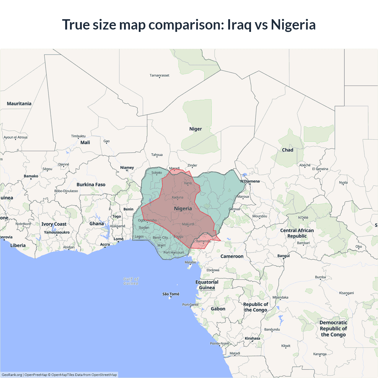 The map above outlines the borders of Iraq and Nigeria but is not accurate for size comparison because it's a 2d map with Mercator projection that distorts territories near the poles. The farther a country is from the equator, the more magnified it appears. More about country size projections.
