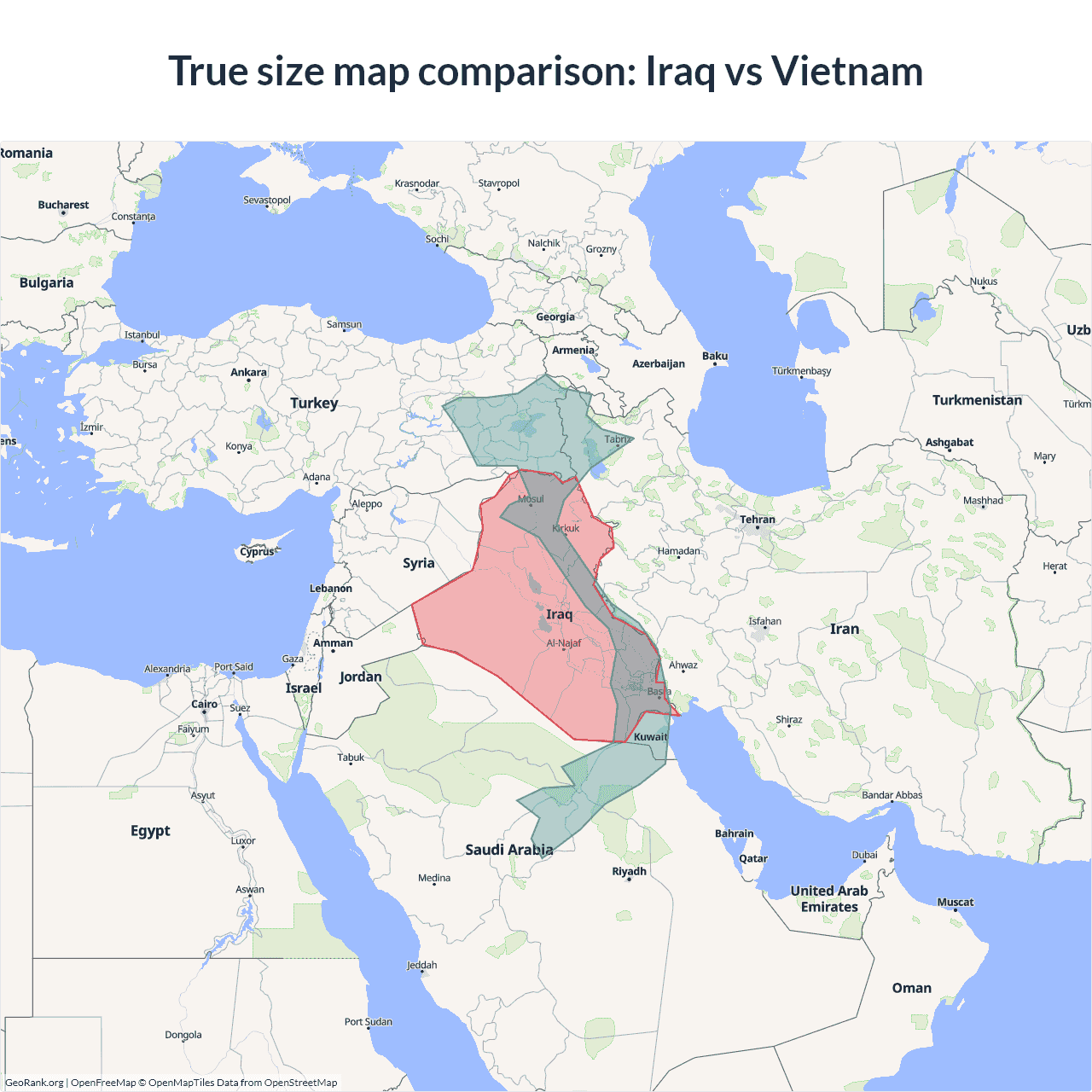 The map above outlines the borders of Iraq and Vietnam but is not accurate for size comparison because it's a 2d map with Mercator projection that distorts territories near the poles. The farther a country is from the equator, the more magnified it appears. More about country size projections.