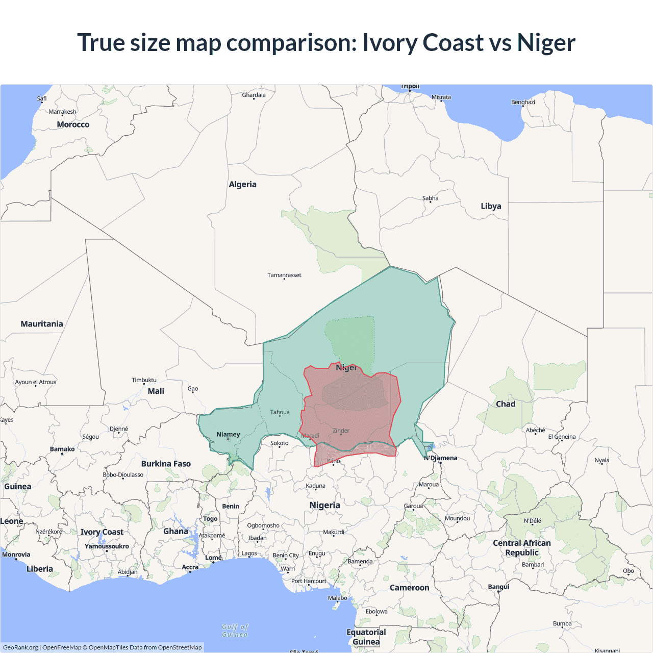 The map above outlines the borders of Ivory Coast and Niger but is not accurate for size comparison because it's a 2d map with Mercator projection that distorts territories near the poles. The farther a country is from the equator, the more magnified it appears. More about country size projections.