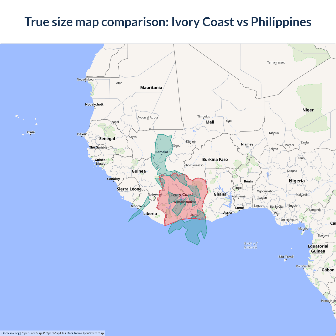 The map above outlines the borders of Ivory Coast and the Philippines but is not accurate for size comparison because it's a 2d map with Mercator projection that distorts territories near the poles. The farther a country is from the equator, the more magnified it appears. More about country size projections.