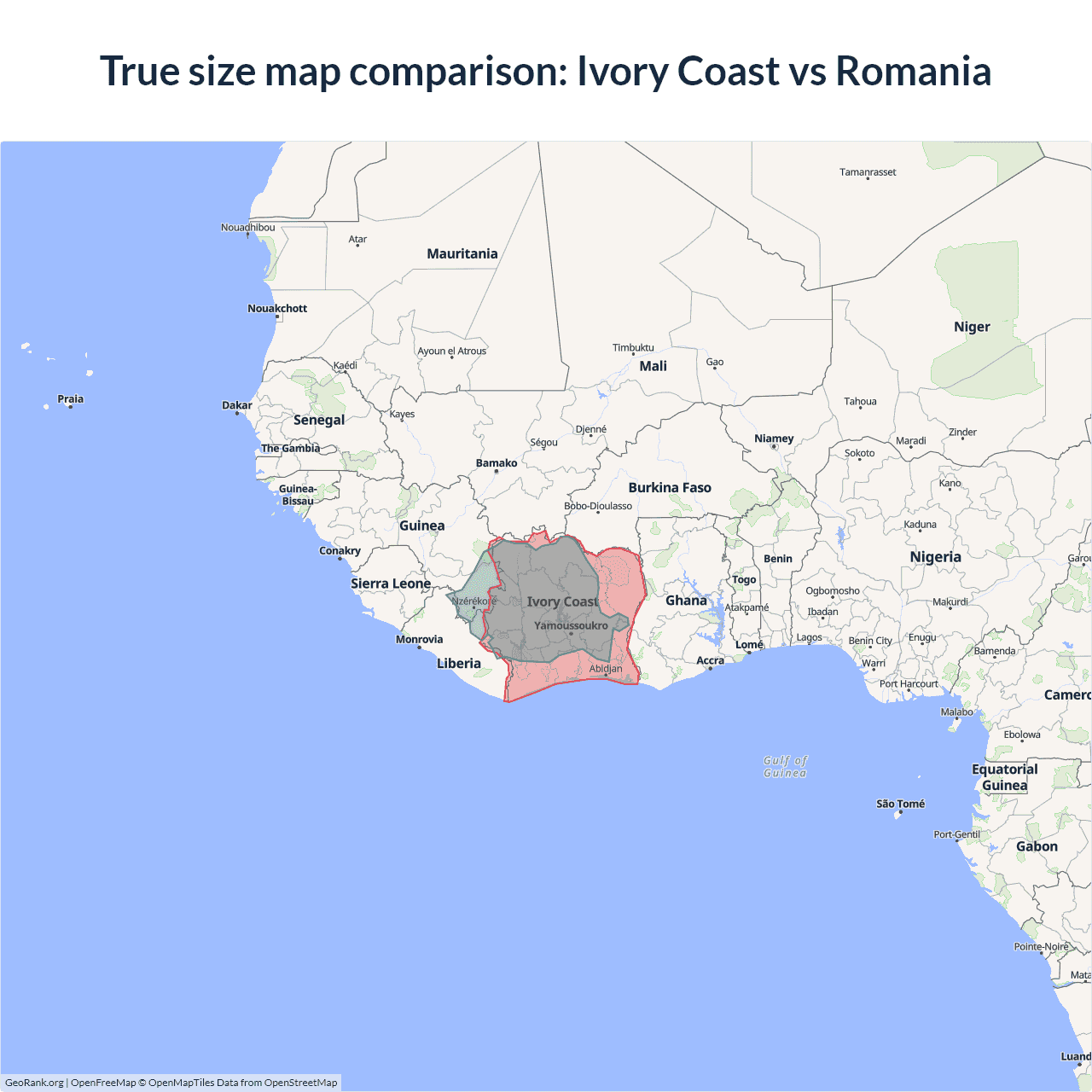 The map above outlines the borders of Ivory Coast and Romania but is not accurate for size comparison because it's a 2d map with Mercator projection that distorts territories near the poles. The farther a country is from the equator, the more magnified it appears. More about country size projections.