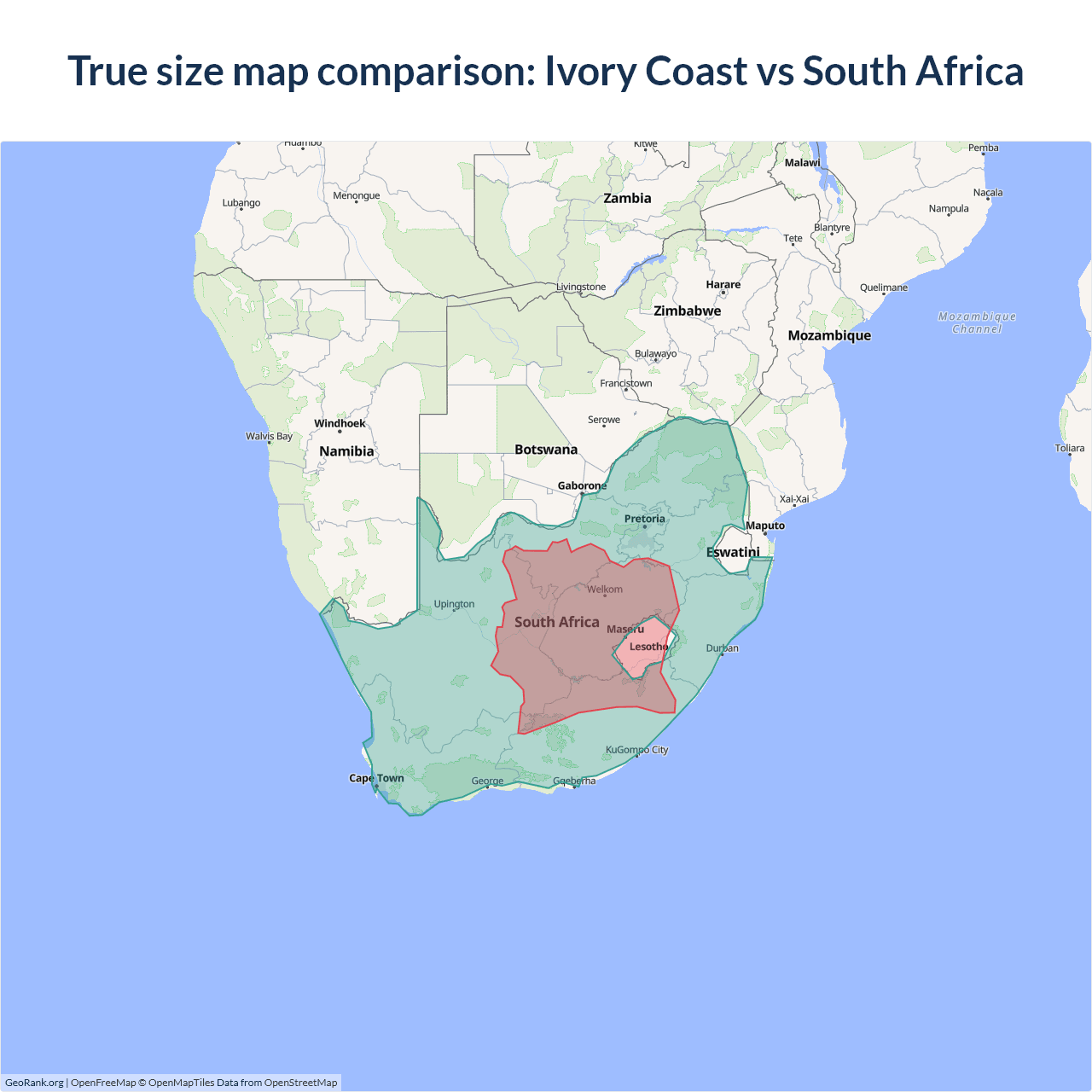 The map above outlines the borders of Ivory Coast and South Africa but is not accurate for size comparison because it's a 2d map with Mercator projection that distorts territories near the poles. The farther a country is from the equator, the more magnified it appears. More about country size projections.