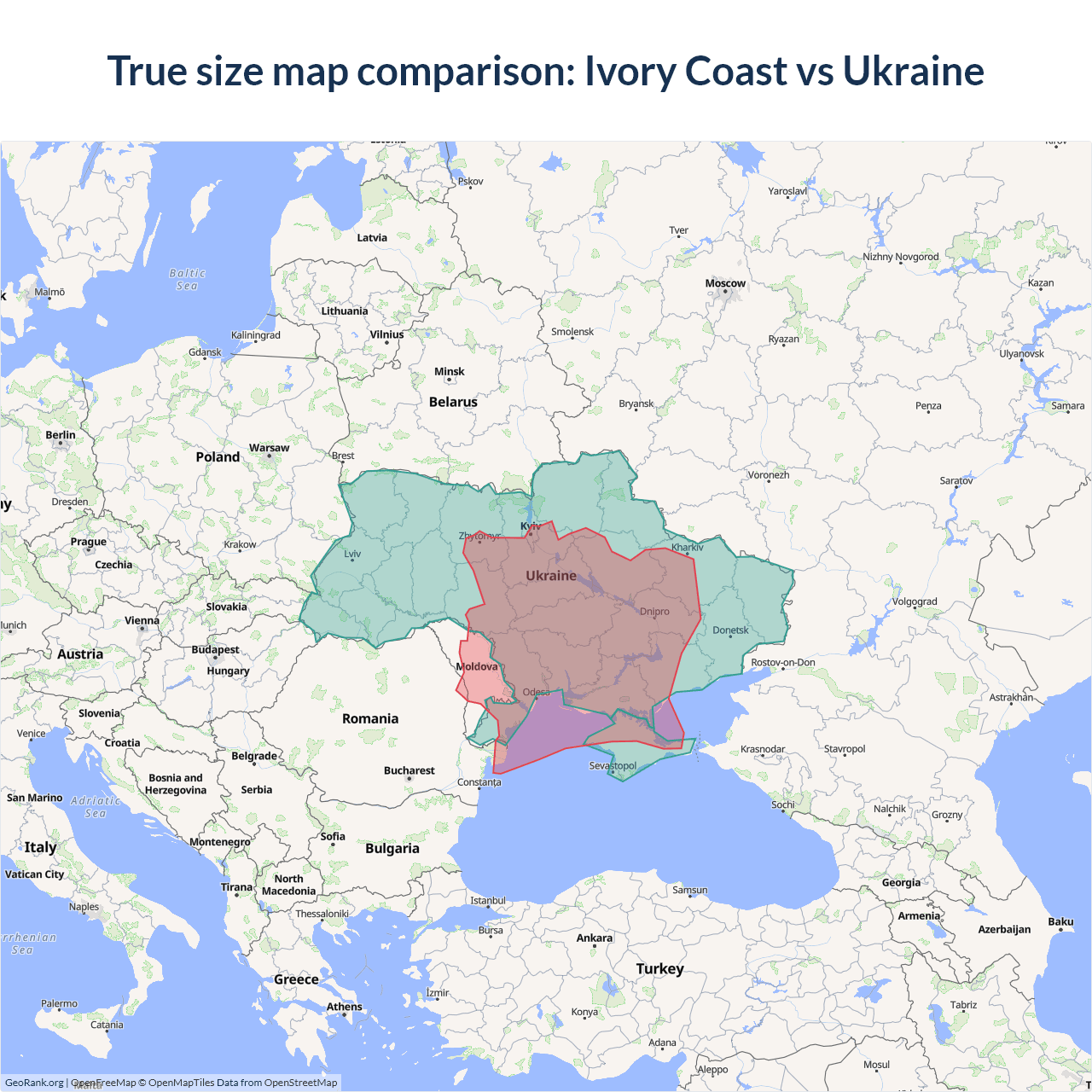 The map above outlines the borders of Ivory Coast and Ukraine but is not accurate for size comparison because it's a 2d map with Mercator projection that distorts territories near the poles. The farther a country is from the equator, the more magnified it appears. More about country size projections.