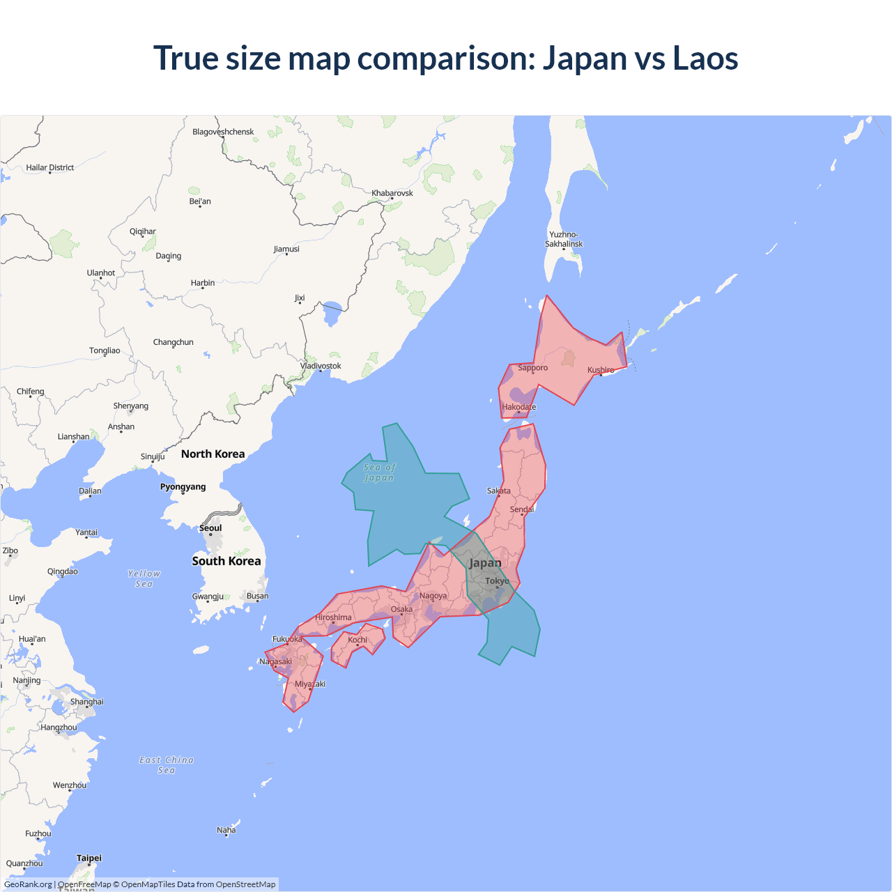 The map above outlines the borders of Japan and Laos but is not accurate for size comparison because it's a 2d map with Mercator projection that distorts territories near the poles. The farther a country is from the equator, the more magnified it appears. More about country size projections.