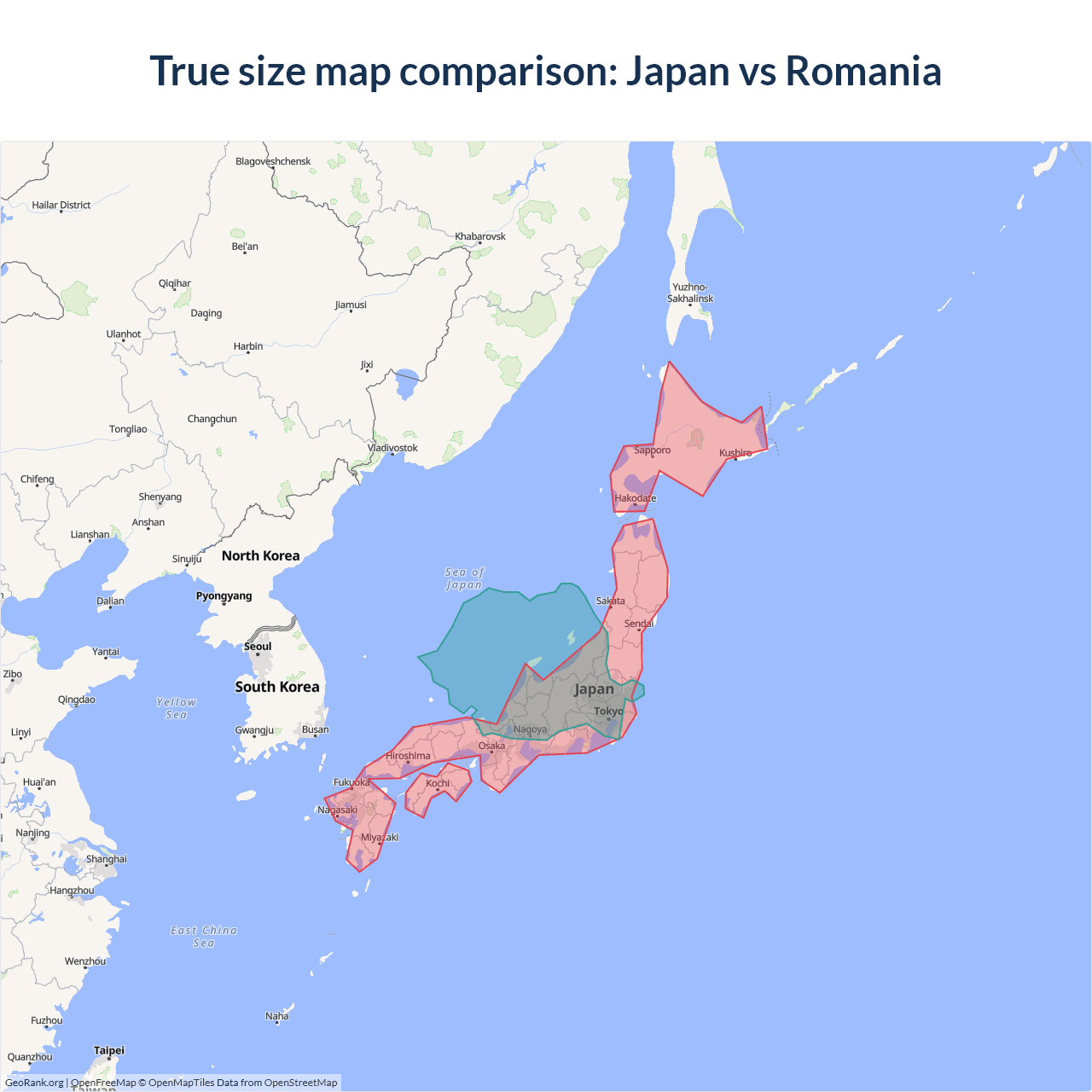 The map above outlines the borders of Japan and Romania but is not accurate for size comparison because it's a 2d map with Mercator projection that distorts territories near the poles. The farther a country is from the equator, the more magnified it appears. More about country size projections.