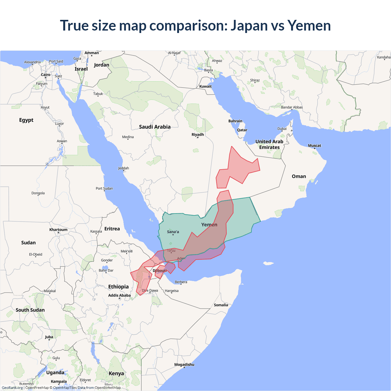 The map above outlines the borders of Japan and Yemen but is not accurate for size comparison because it's a 2d map with Mercator projection that distorts territories near the poles. The farther a country is from the equator, the more magnified it appears. More about country size projections.