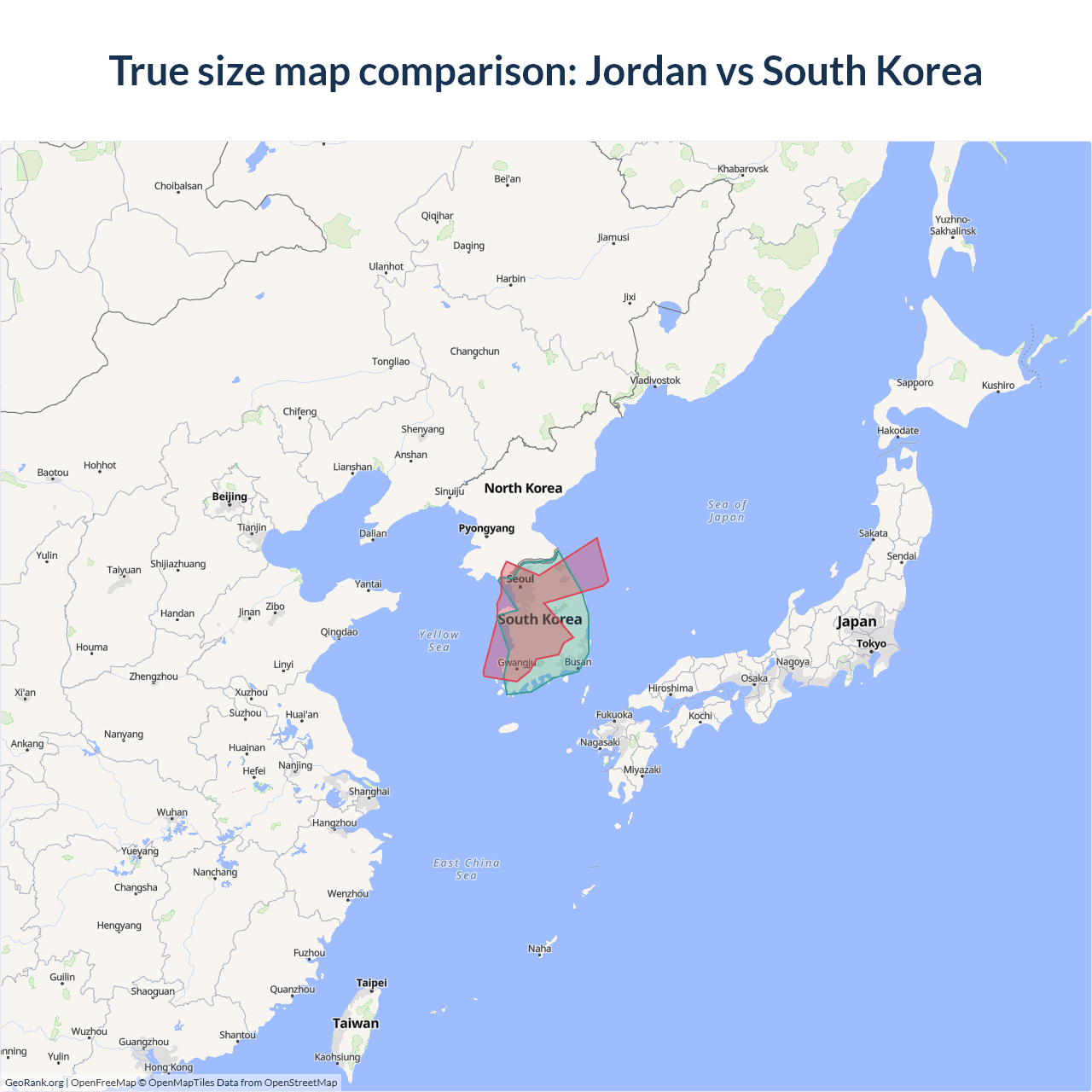 The map above outlines the borders of Jordan and South Korea but is not accurate for size comparison because it's a 2d map with Mercator projection that distorts territories near the poles. The farther a country is from the equator, the more magnified it appears. More about country size projections.