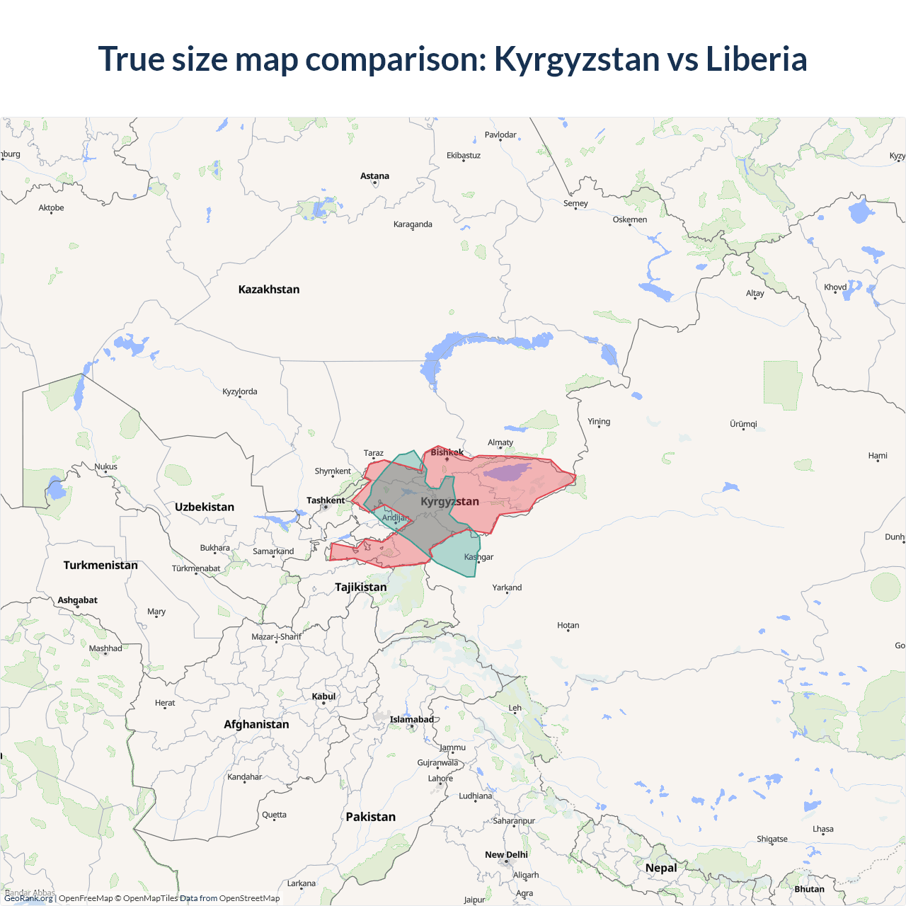 The map above outlines the borders of Kyrgyzstan and Liberia but is not accurate for size comparison because it's a 2d map with Mercator projection that distorts territories near the poles. The farther a country is from the equator, the more magnified it appears. More about country size projections.