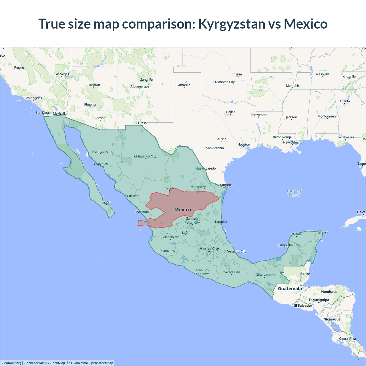 The map above outlines the borders of Kyrgyzstan and Mexico but is not accurate for size comparison because it's a 2d map with Mercator projection that distorts territories near the poles. The farther a country is from the equator, the more magnified it appears. More about country size projections.