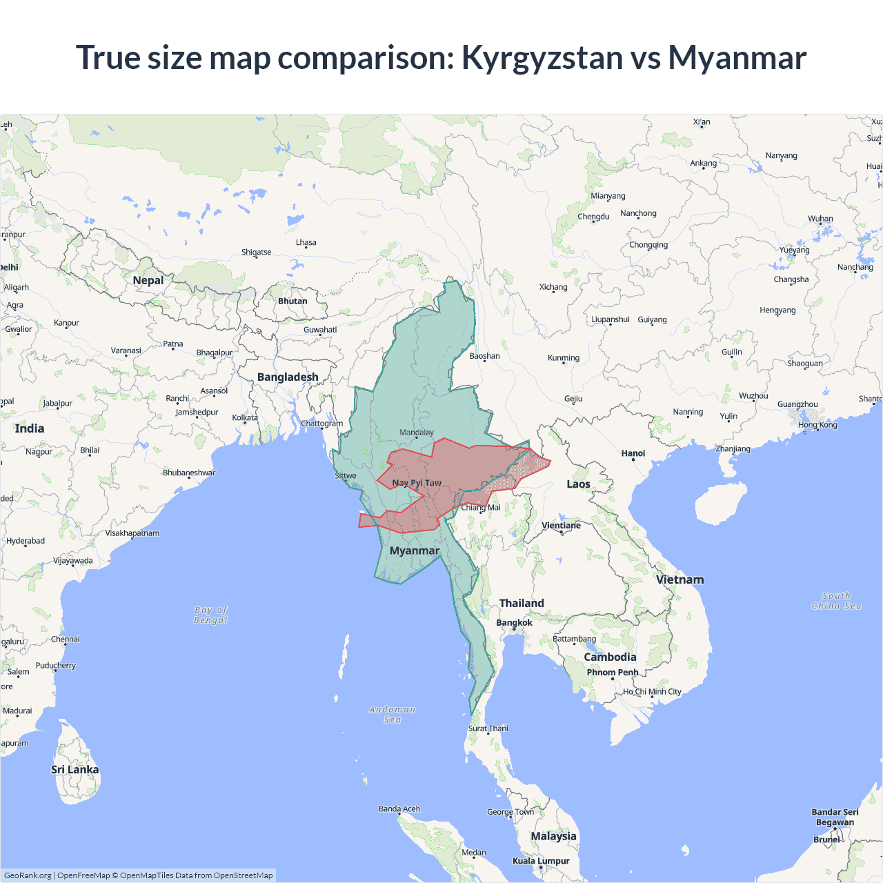 The map above outlines the borders of Kyrgyzstan and Myanmar but is not accurate for size comparison because it's a 2d map with Mercator projection that distorts territories near the poles. The farther a country is from the equator, the more magnified it appears. More about country size projections.