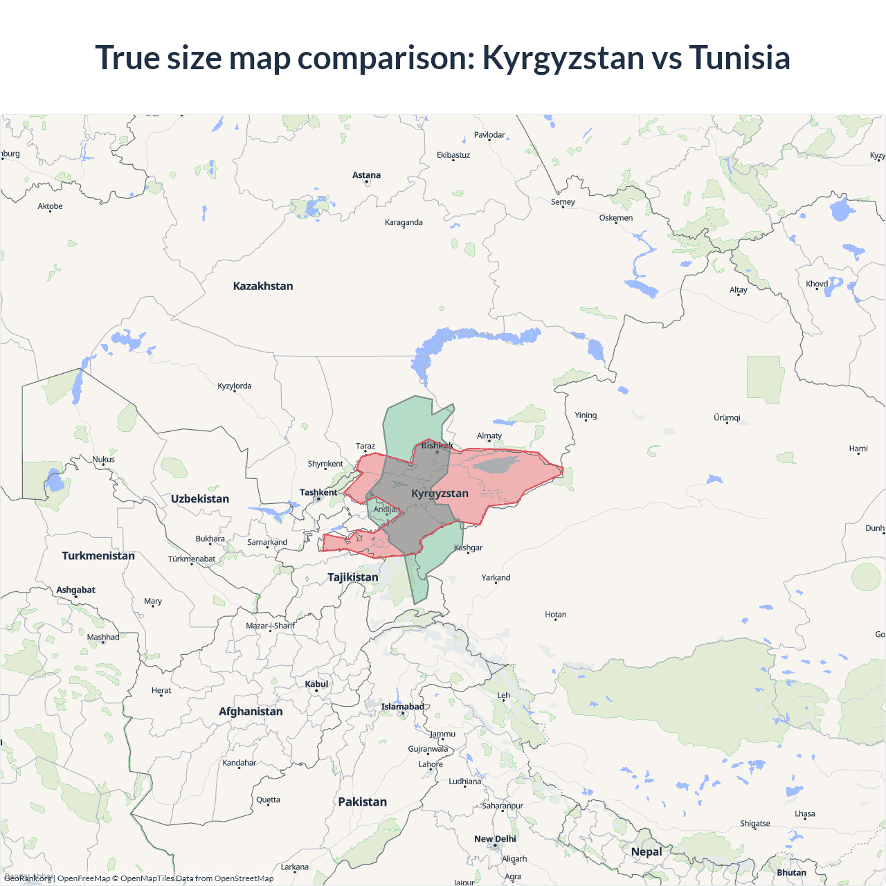 The map above outlines the borders of Kyrgyzstan and Tunisia but is not accurate for size comparison because it's a 2d map with Mercator projection that distorts territories near the poles. The farther a country is from the equator, the more magnified it appears. More about country size projections.
