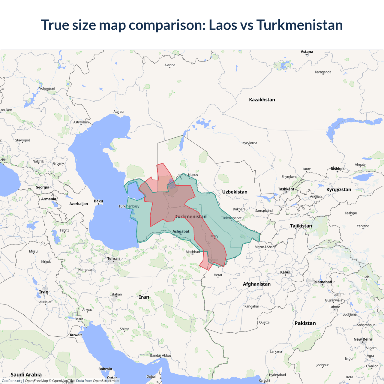 The map above outlines the borders of Laos and Turkmenistan but is not accurate for size comparison because it's a 2d map with Mercator projection that distorts territories near the poles. The farther a country is from the equator, the more magnified it appears. More about country size projections.
